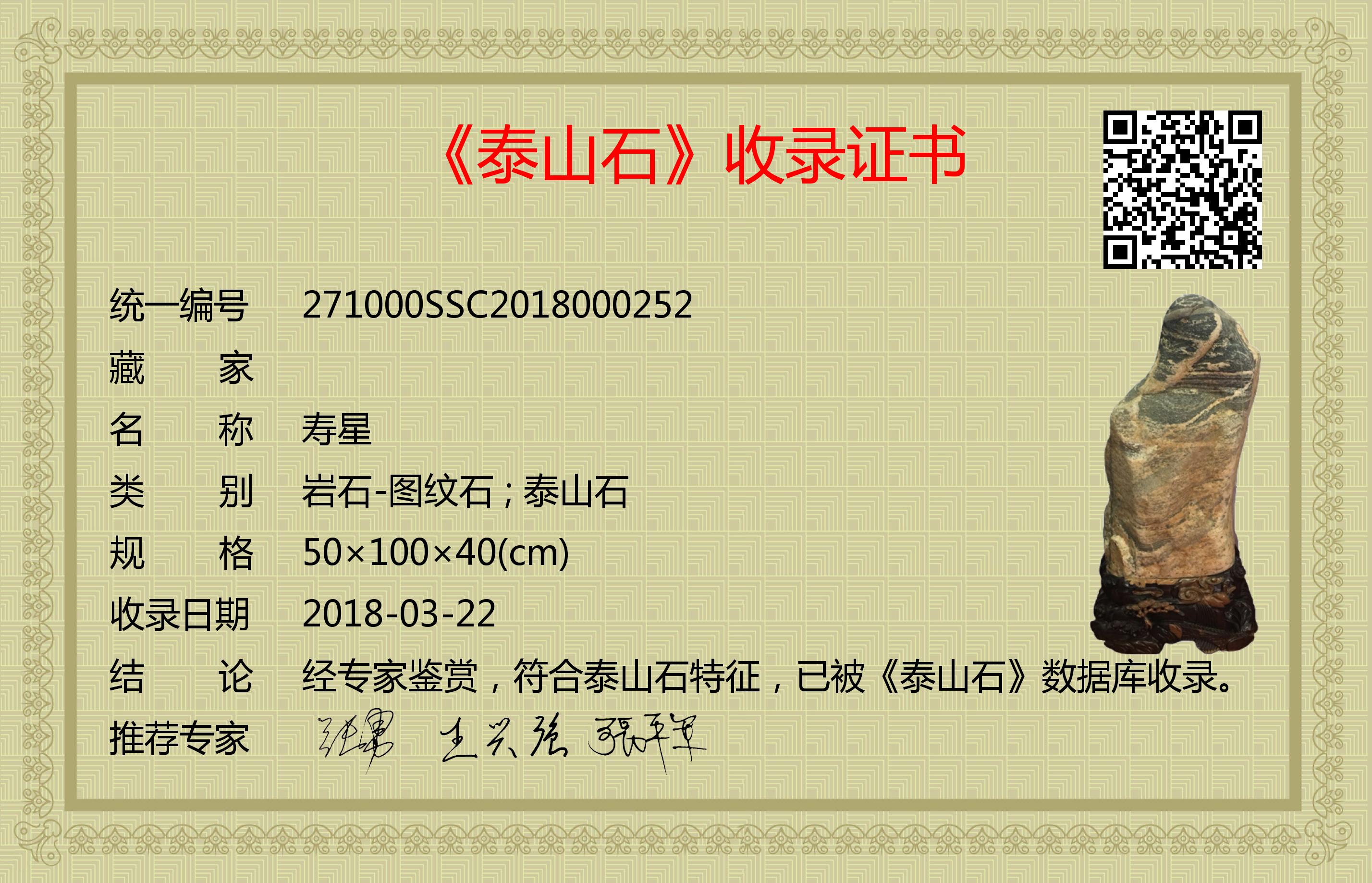 经专家鉴赏,符合泰山石特征,已被《泰山石》数据库收录。