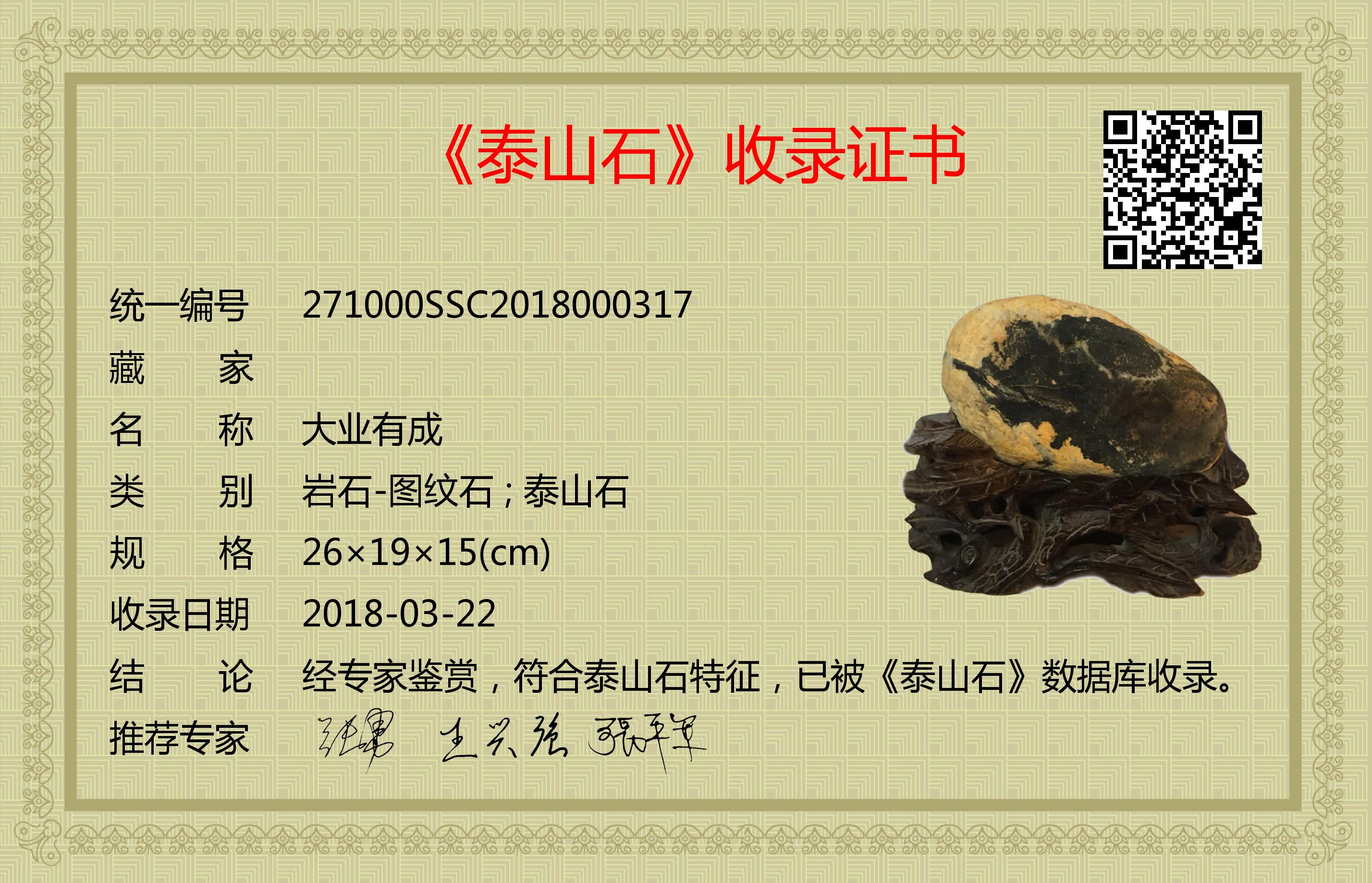 经专家鉴赏,符合泰山石特征,已被《泰山石》数据库收录。