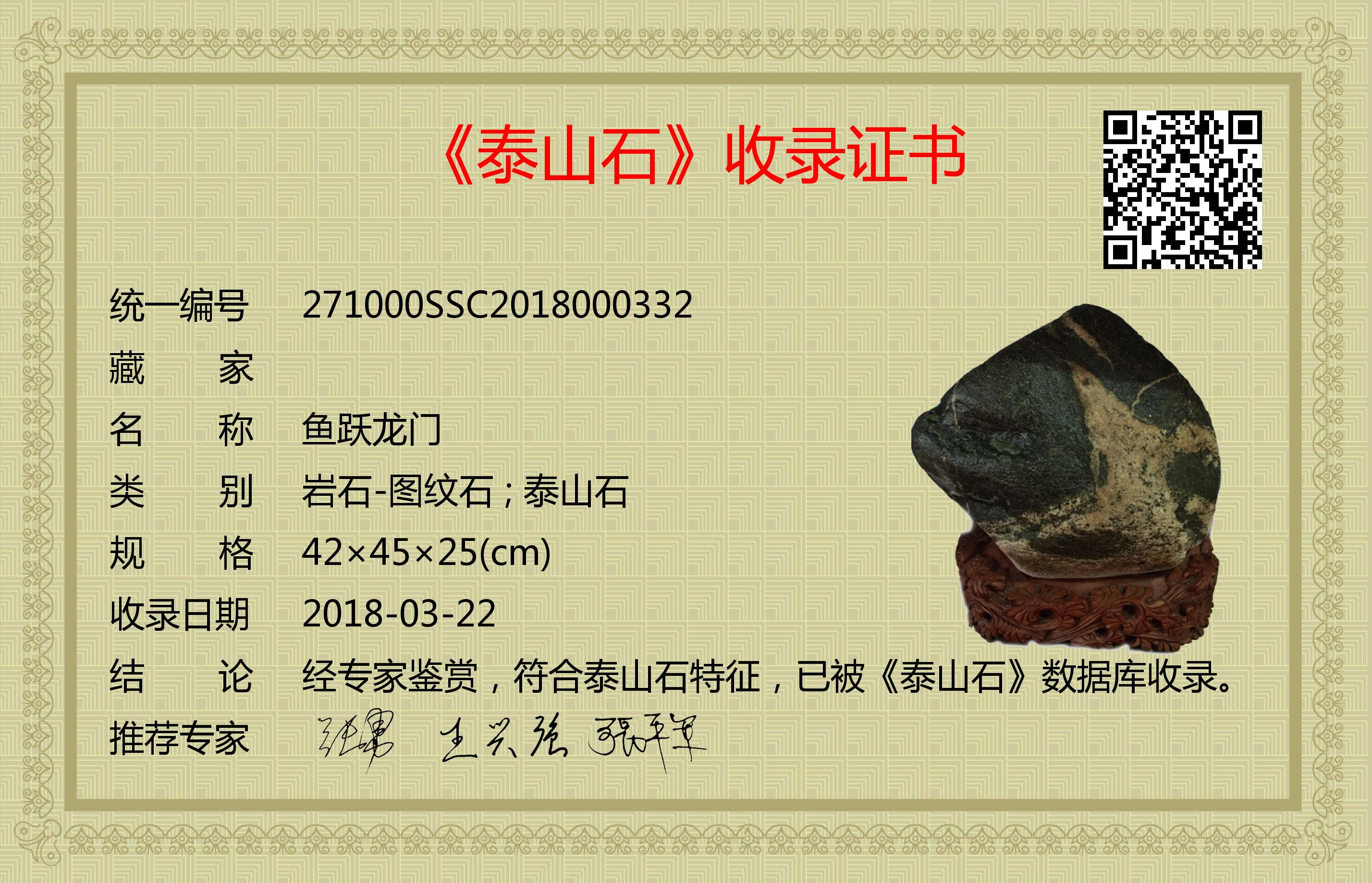 经专家鉴赏,符合泰山石特征,已被《泰山石》数据库收录。