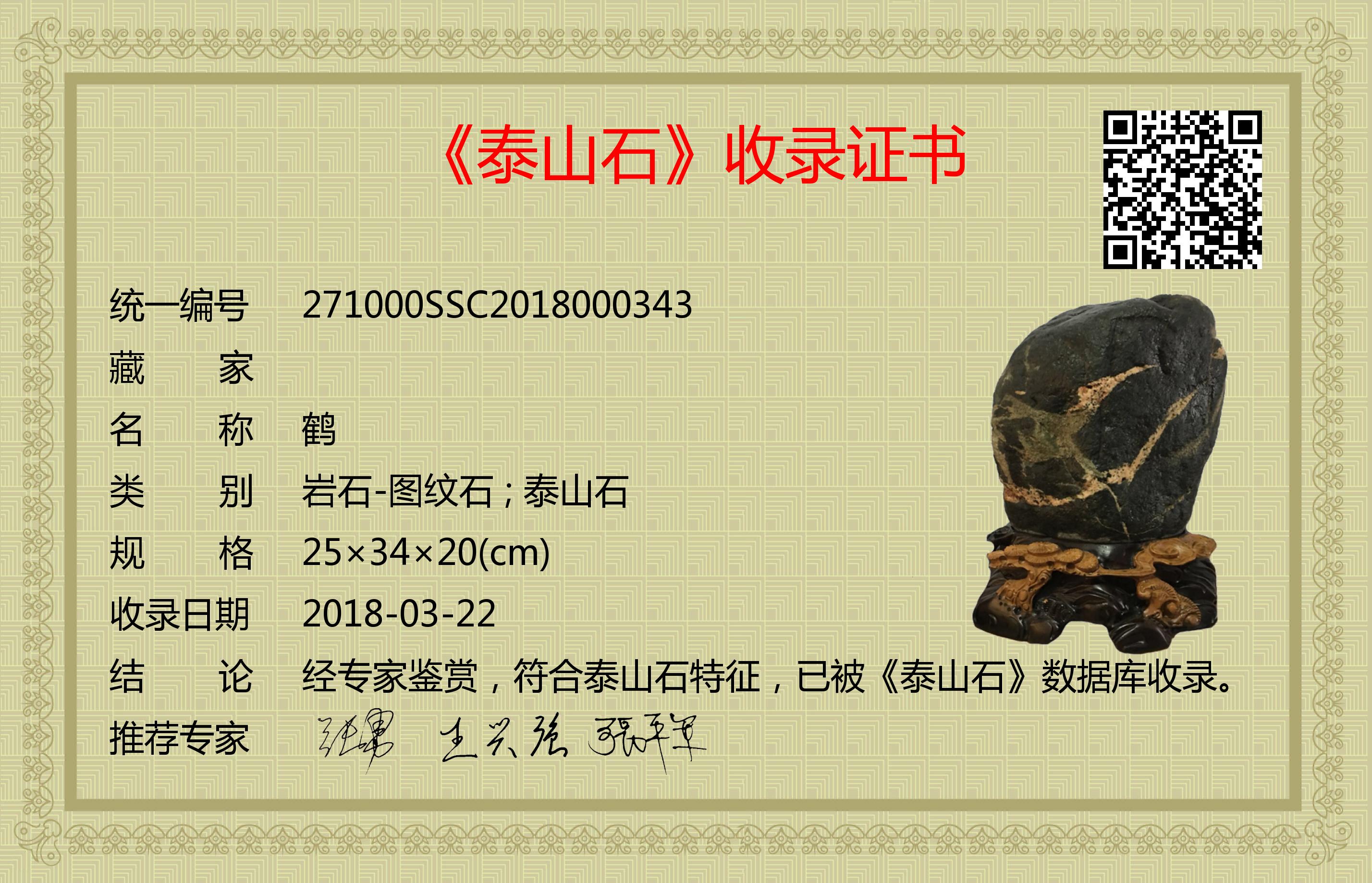 经专家鉴赏,符合泰山石特征,已被《泰山石》数据库收录。