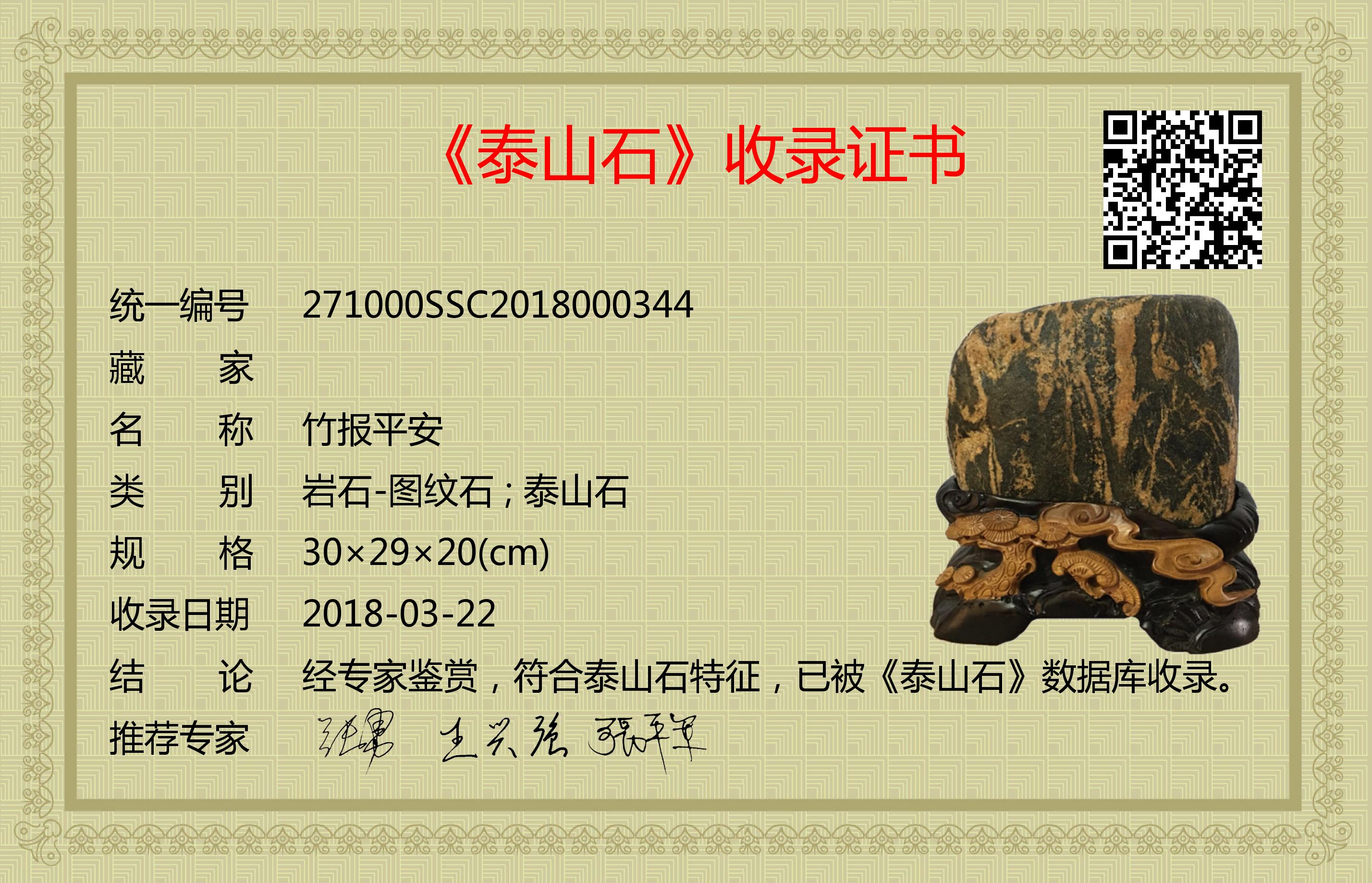 经专家鉴赏,符合泰山石特征,已被《泰山石》数据库收录。