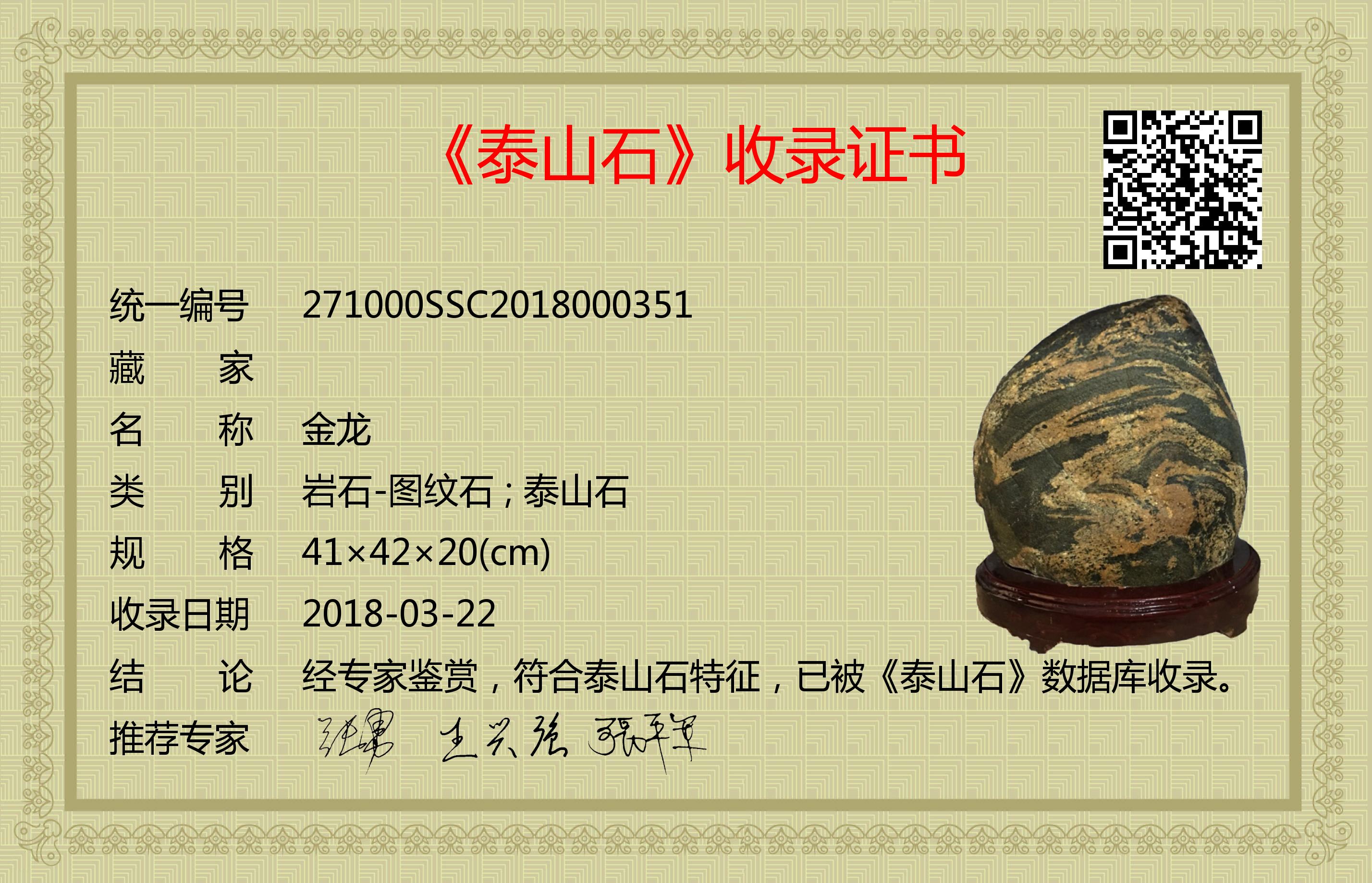 经专家鉴赏,符合泰山石特征,已被《泰山石》数据库收录。