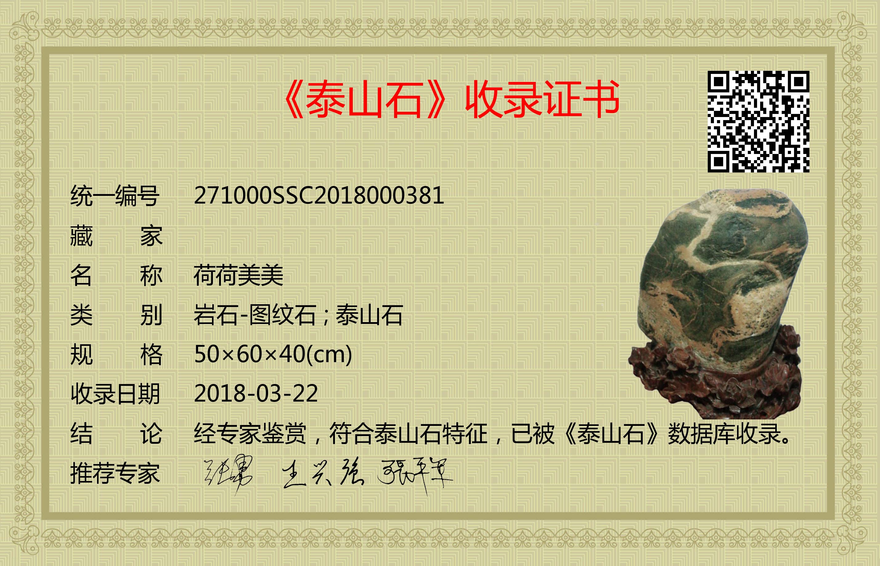 经专家鉴赏,符合泰山石特征,已被《泰山石》数据库收录。