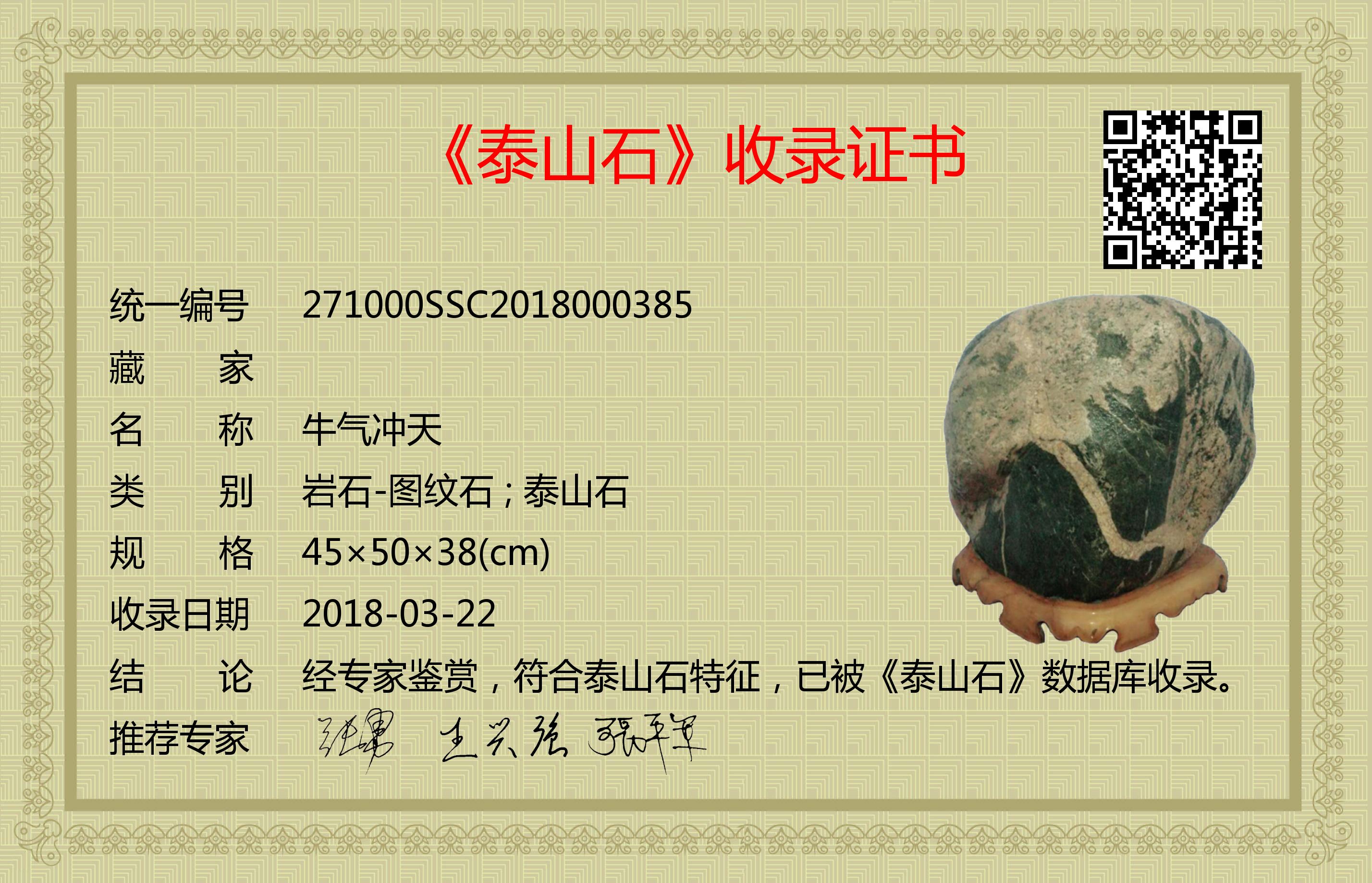 经专家鉴赏,符合泰山石特征,已被《泰山石》数据库收录。