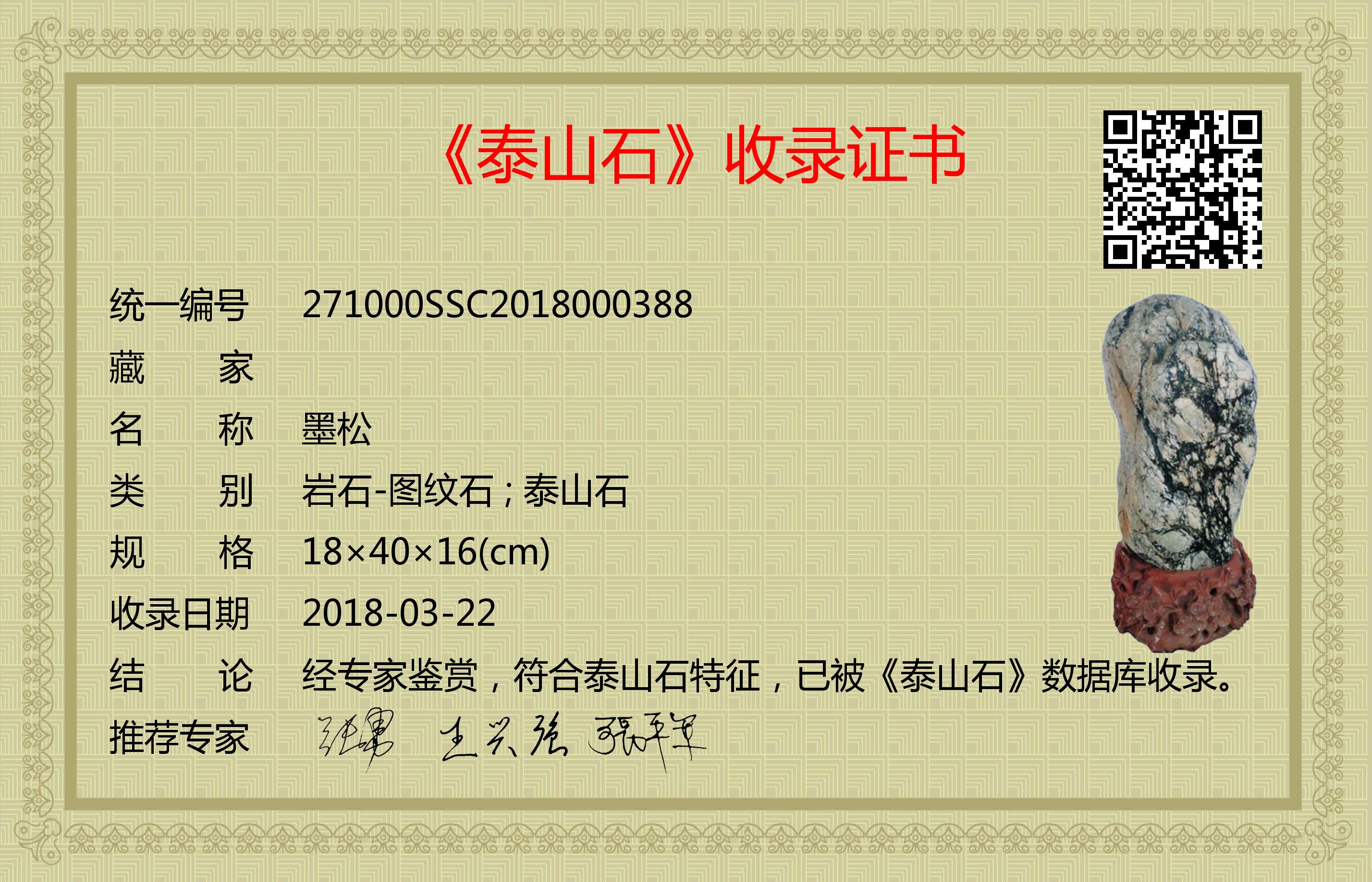 经专家鉴赏,符合泰山石特征,已被《泰山石》数据库收录。
