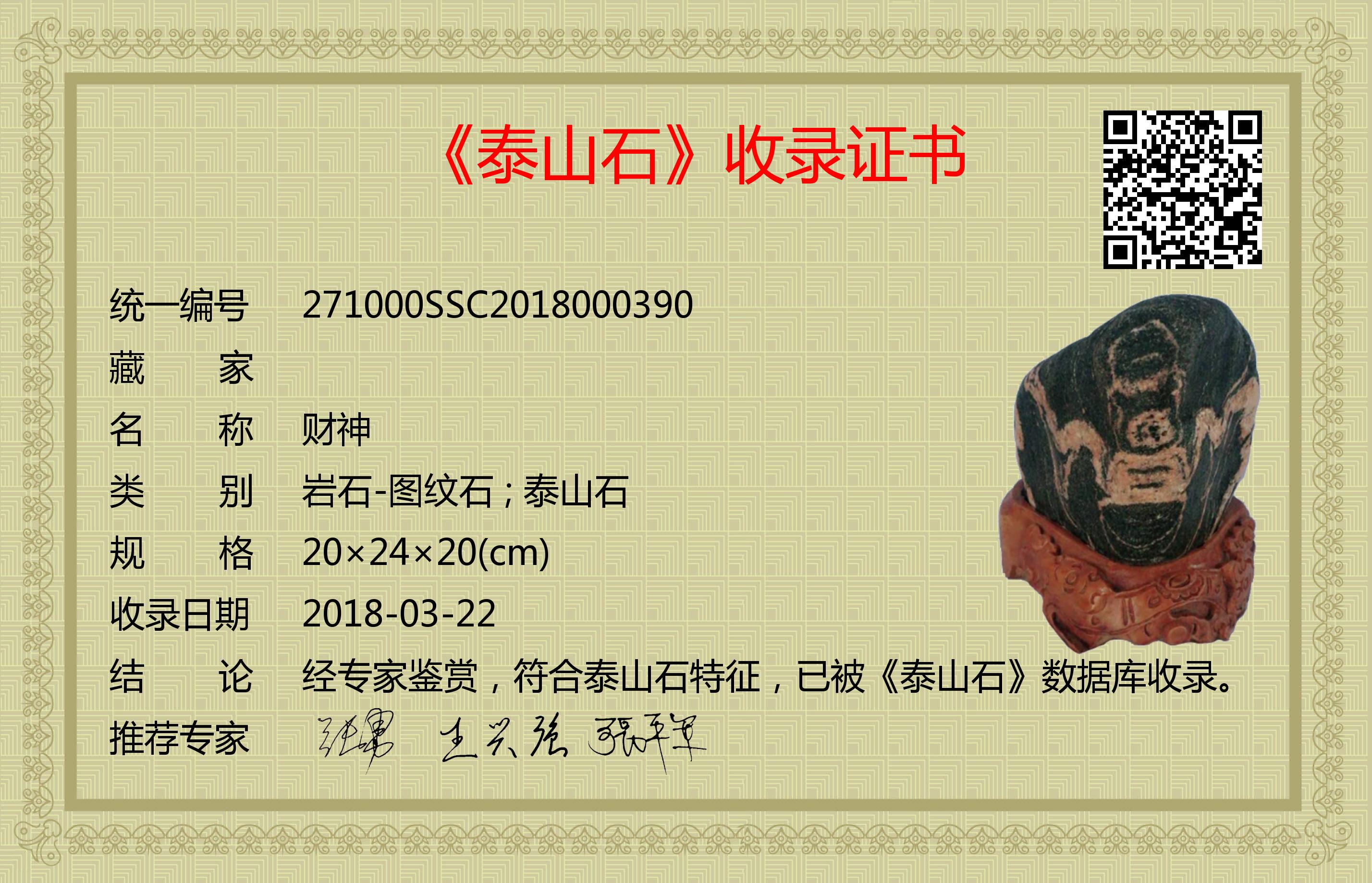 经专家鉴赏,符合泰山石特征,已被《泰山石》数据库收录。