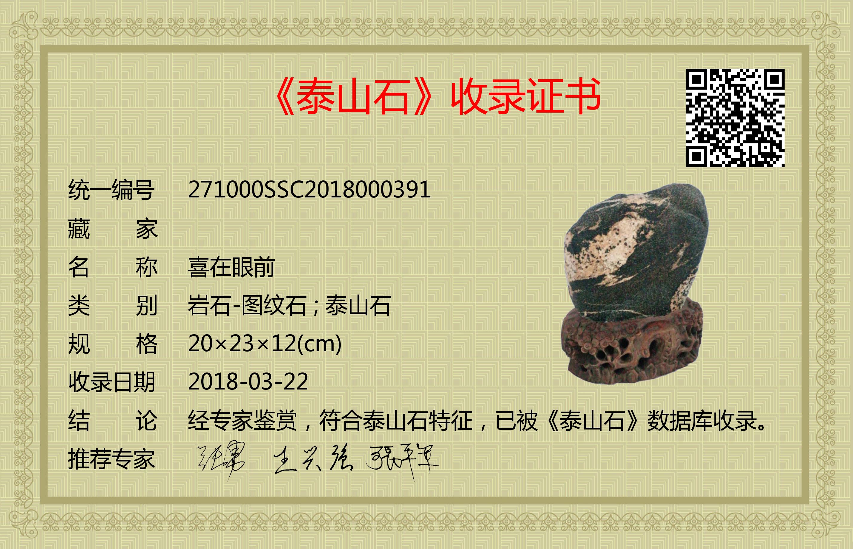 经专家鉴赏,符合泰山石特征,已被《泰山石》数据库收录。