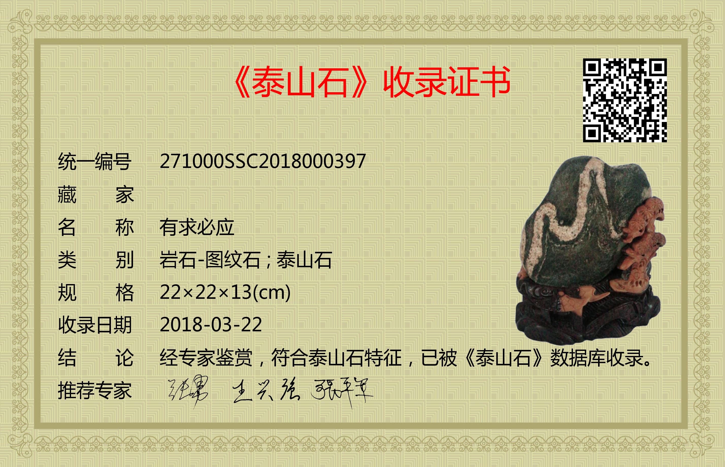 经专家鉴赏,符合泰山石特征,已被《泰山石》数据库收录。