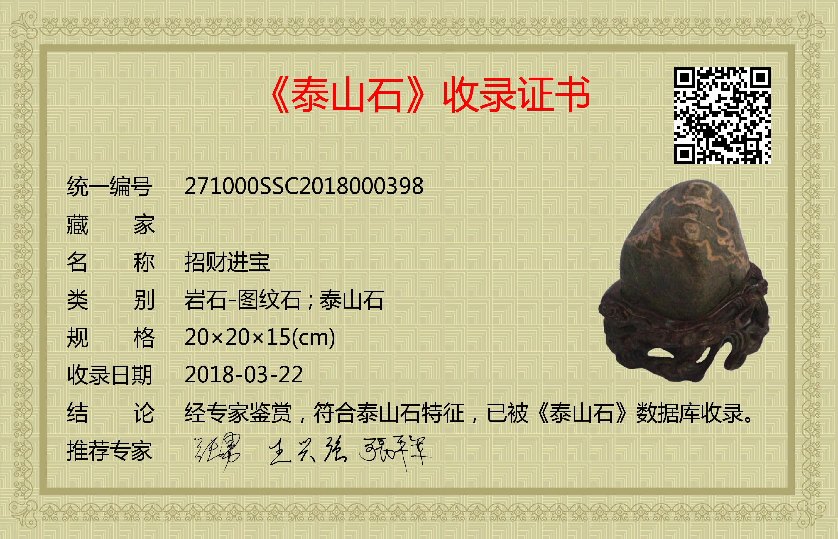 经专家鉴赏,符合泰山石特征,已被《泰山石》数据库收录。
