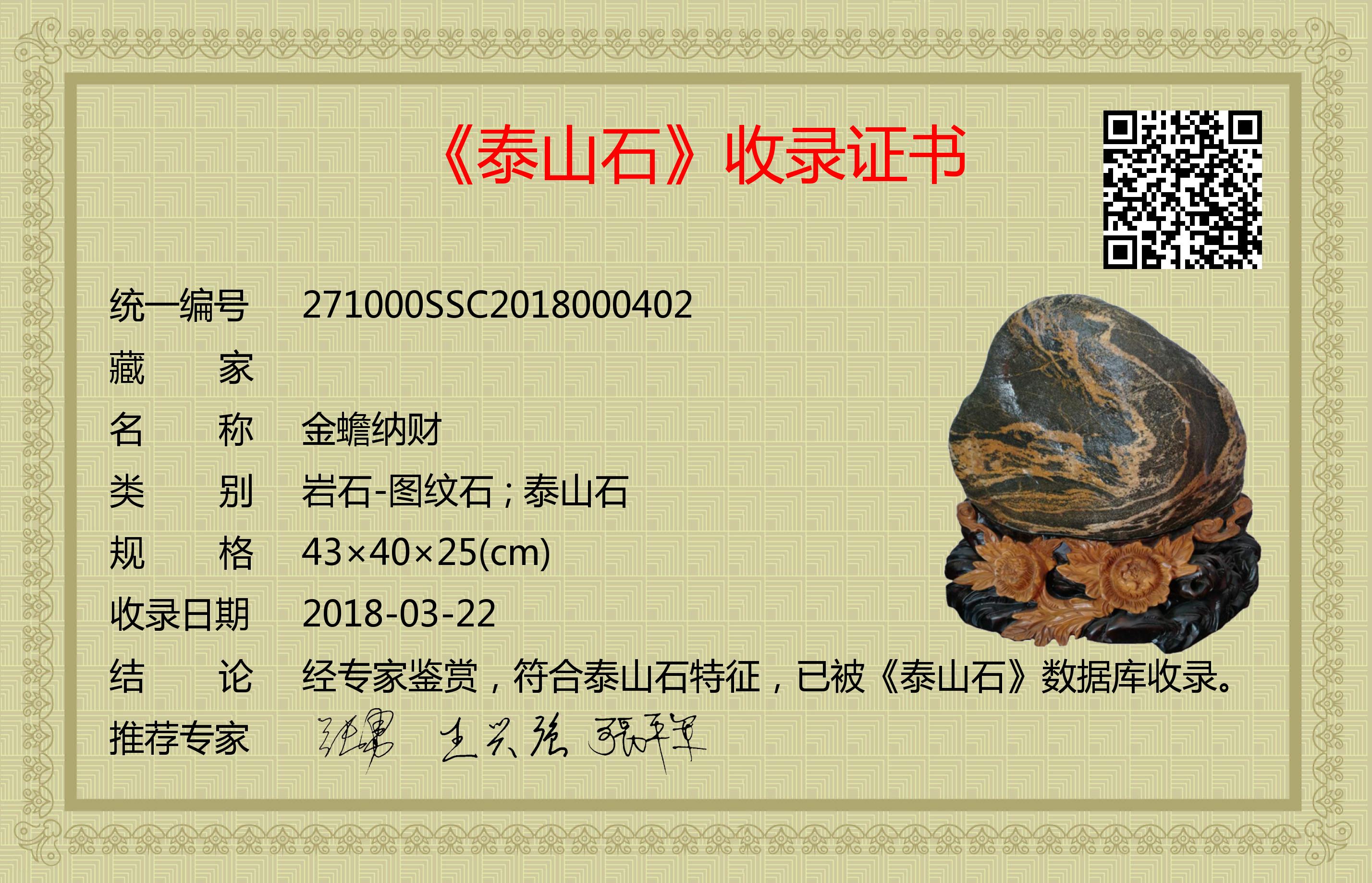 经专家鉴赏,符合泰山石特征,已被《泰山石》数据库收录。