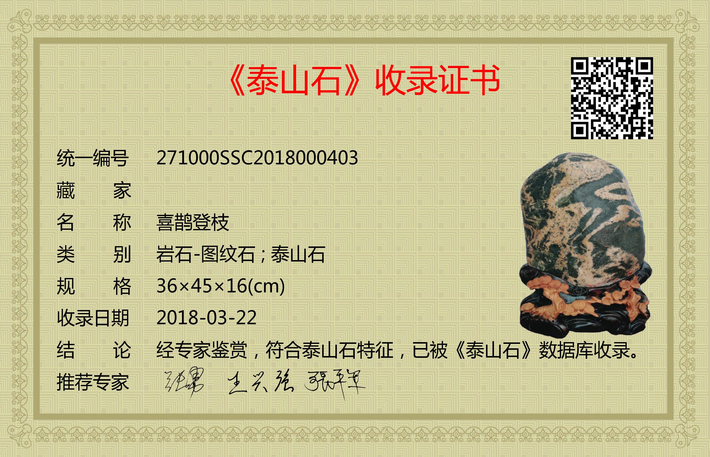 经专家鉴赏,符合泰山石特征,已被《泰山石》数据库收录。