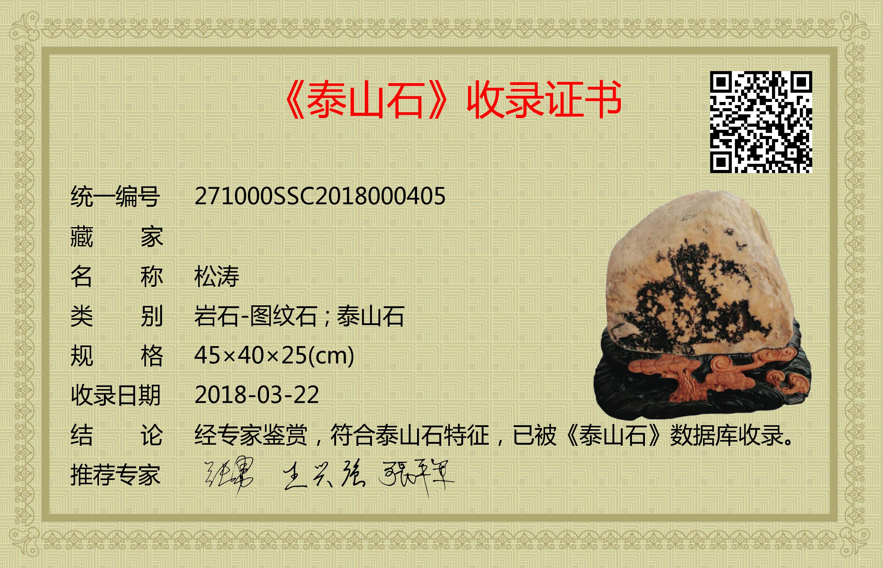 经专家鉴赏,符合泰山石特征,已被《泰山石》数据库收录。