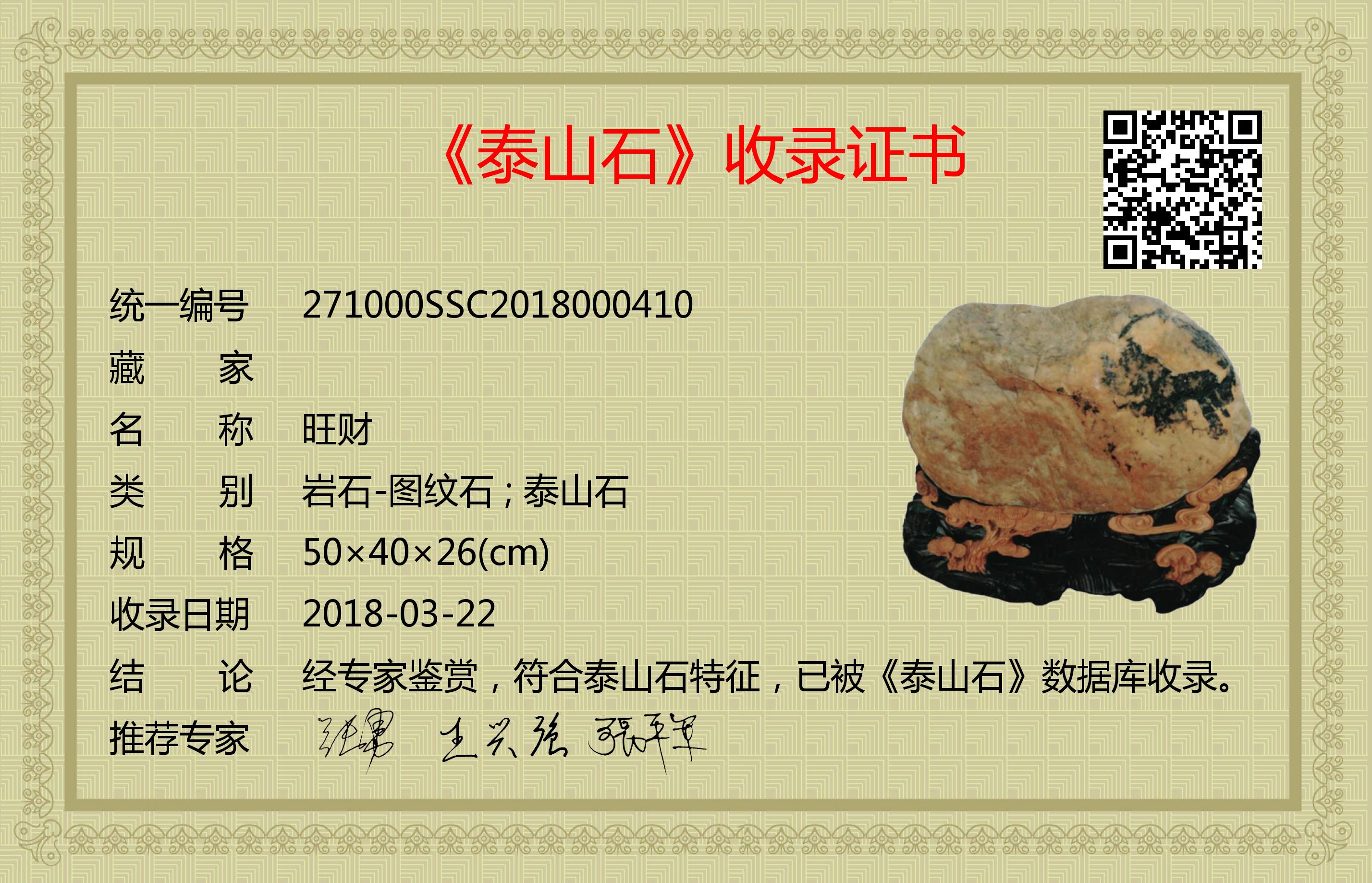 经专家鉴赏,符合泰山石特征,已被《泰山石》数据库收录。
