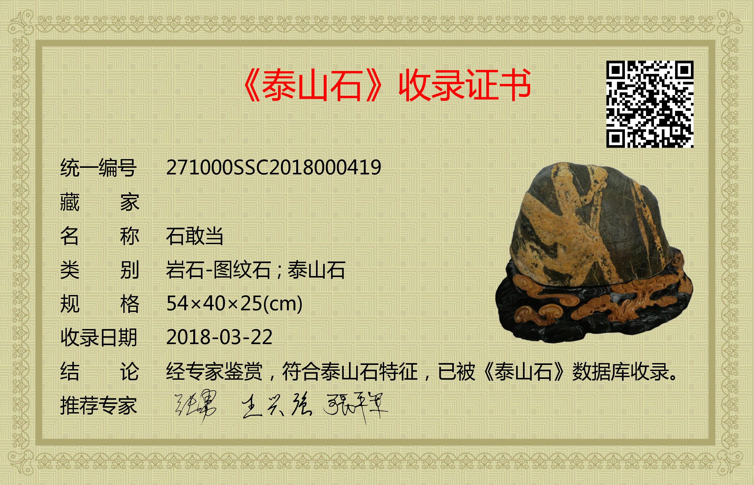 经专家鉴赏,符合泰山石特征,已被《泰山石》数据库收录。