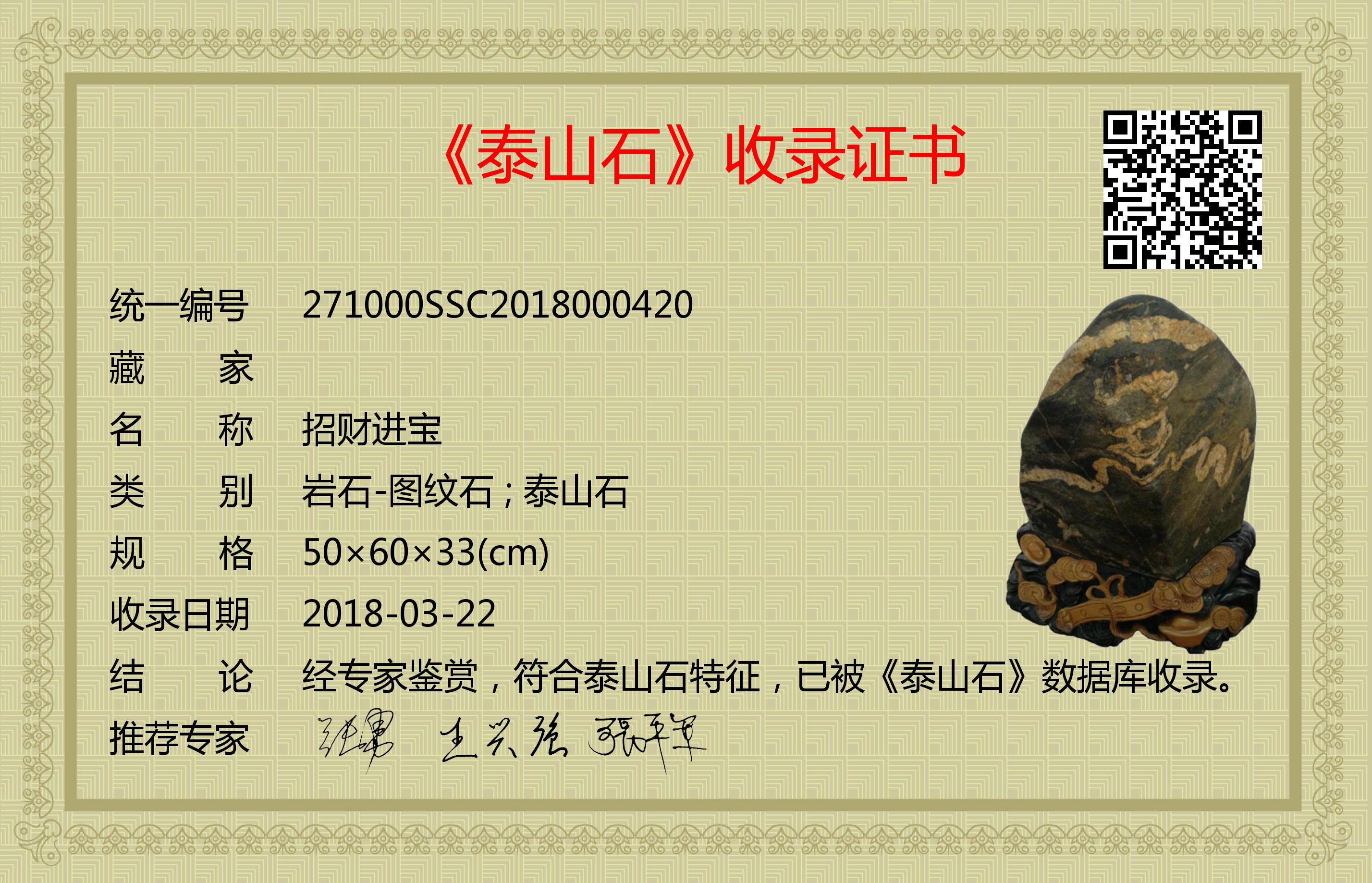 经专家鉴赏,符合泰山石特征,已被《泰山石》数据库收录。