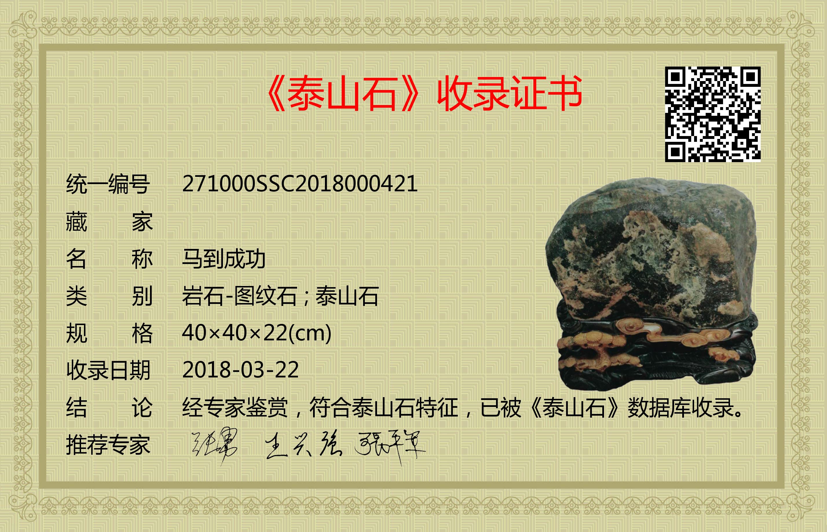 经专家鉴赏,符合泰山石特征,已被《泰山石》数据库收录。