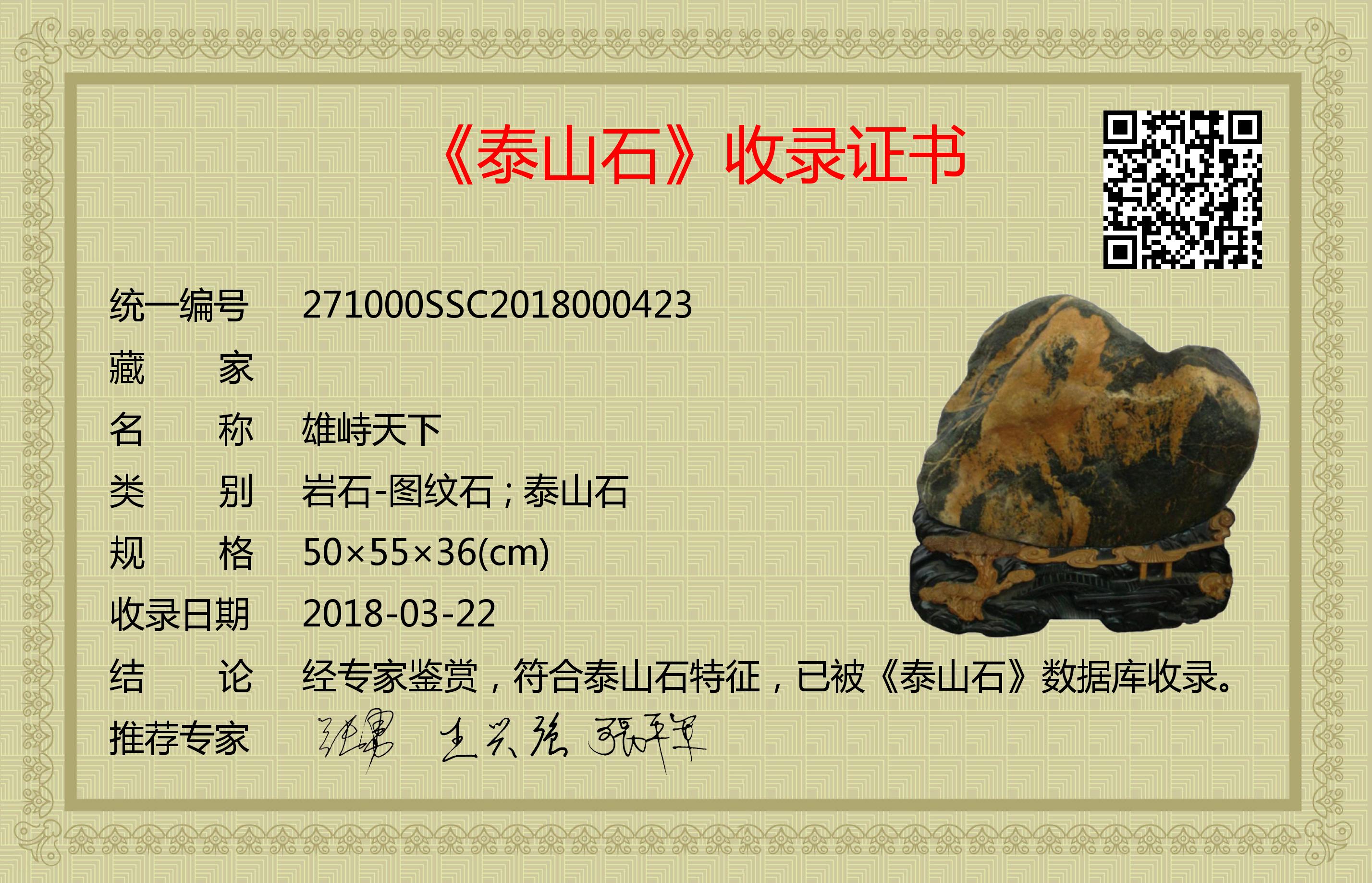 经专家鉴赏,符合泰山石特征,已被《泰山石》数据库收录。