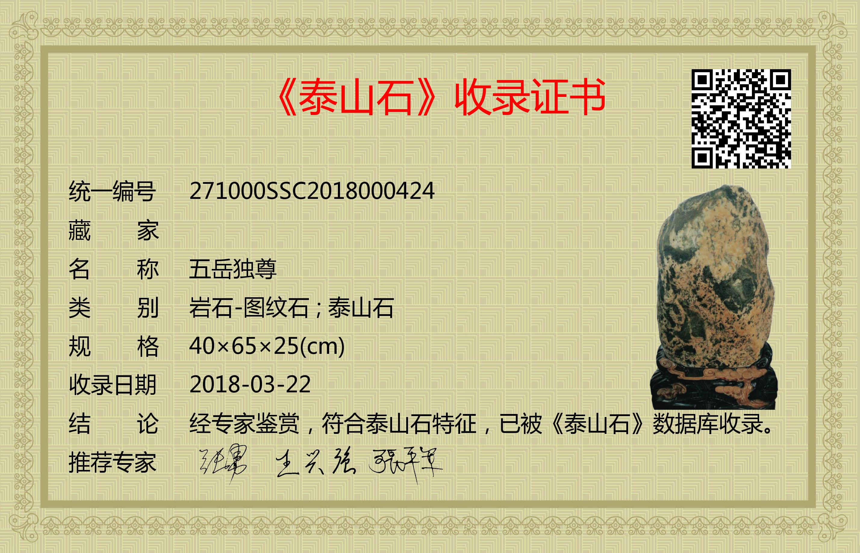 经专家鉴赏,符合泰山石特征,已被《泰山石》数据库收录。
