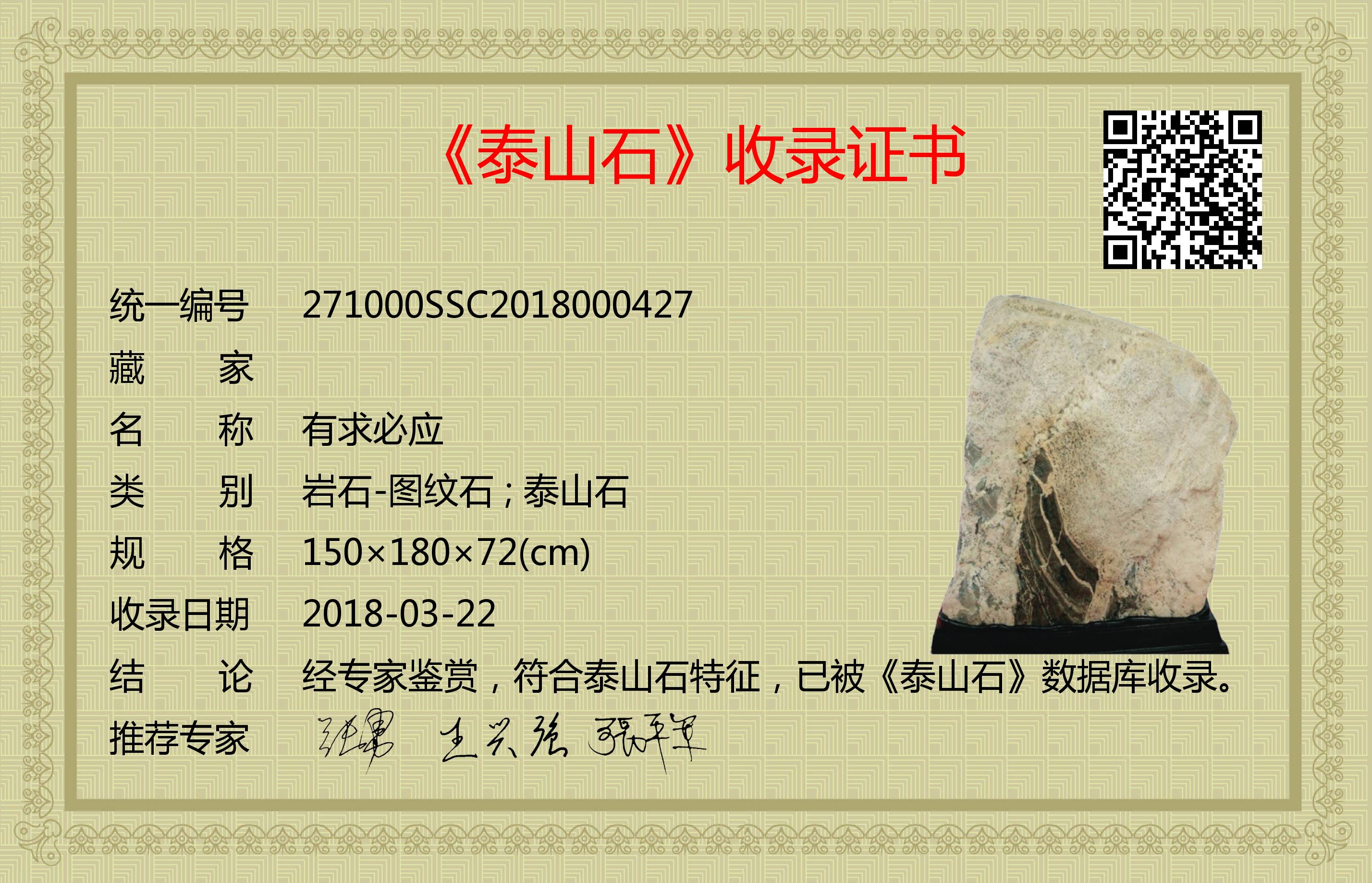 经专家鉴赏,符合泰山石特征,已被《泰山石》数据库收录。