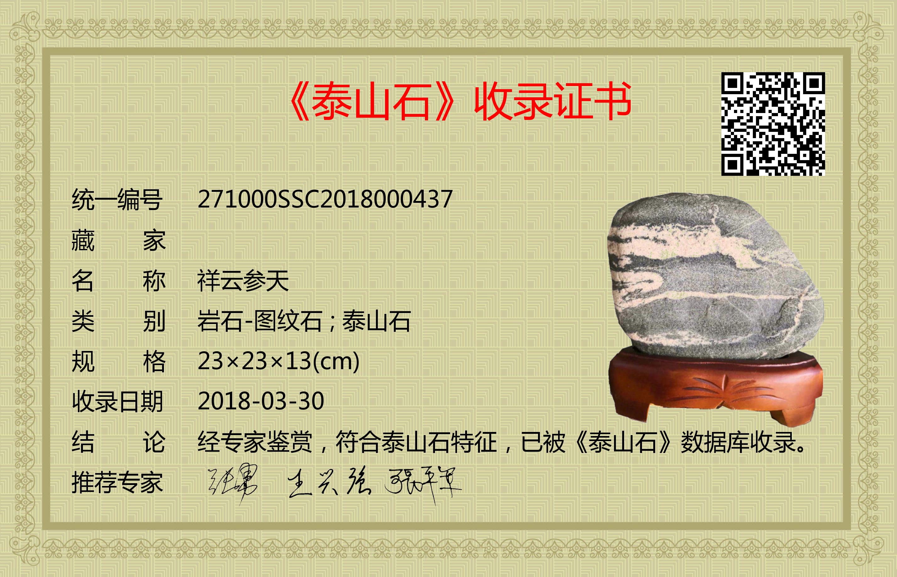 经专家鉴赏,符合泰山石特征,已被《泰山石》数据库收录。