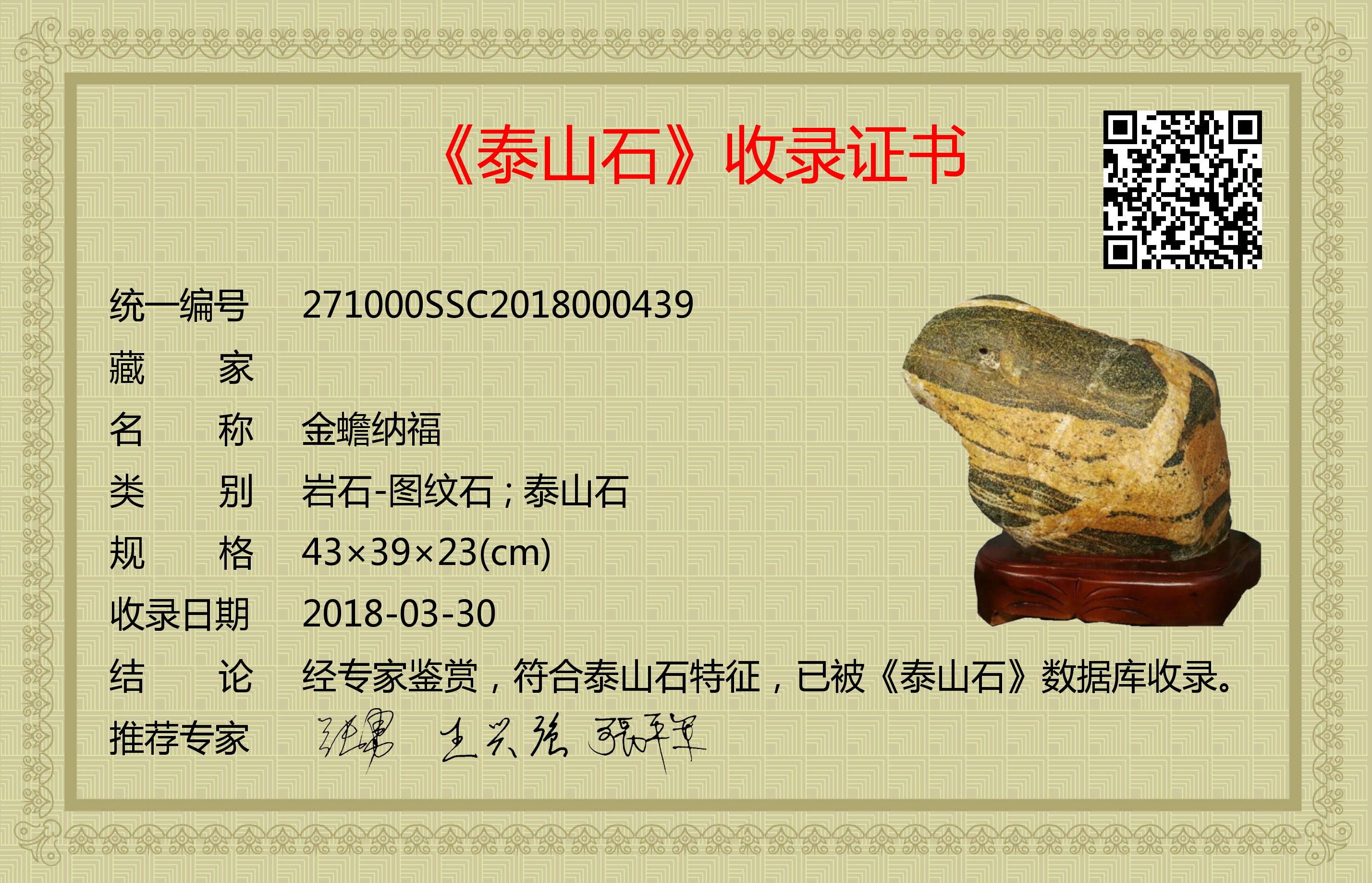 经专家鉴赏,符合泰山石特征,已被《泰山石》数据库收录。