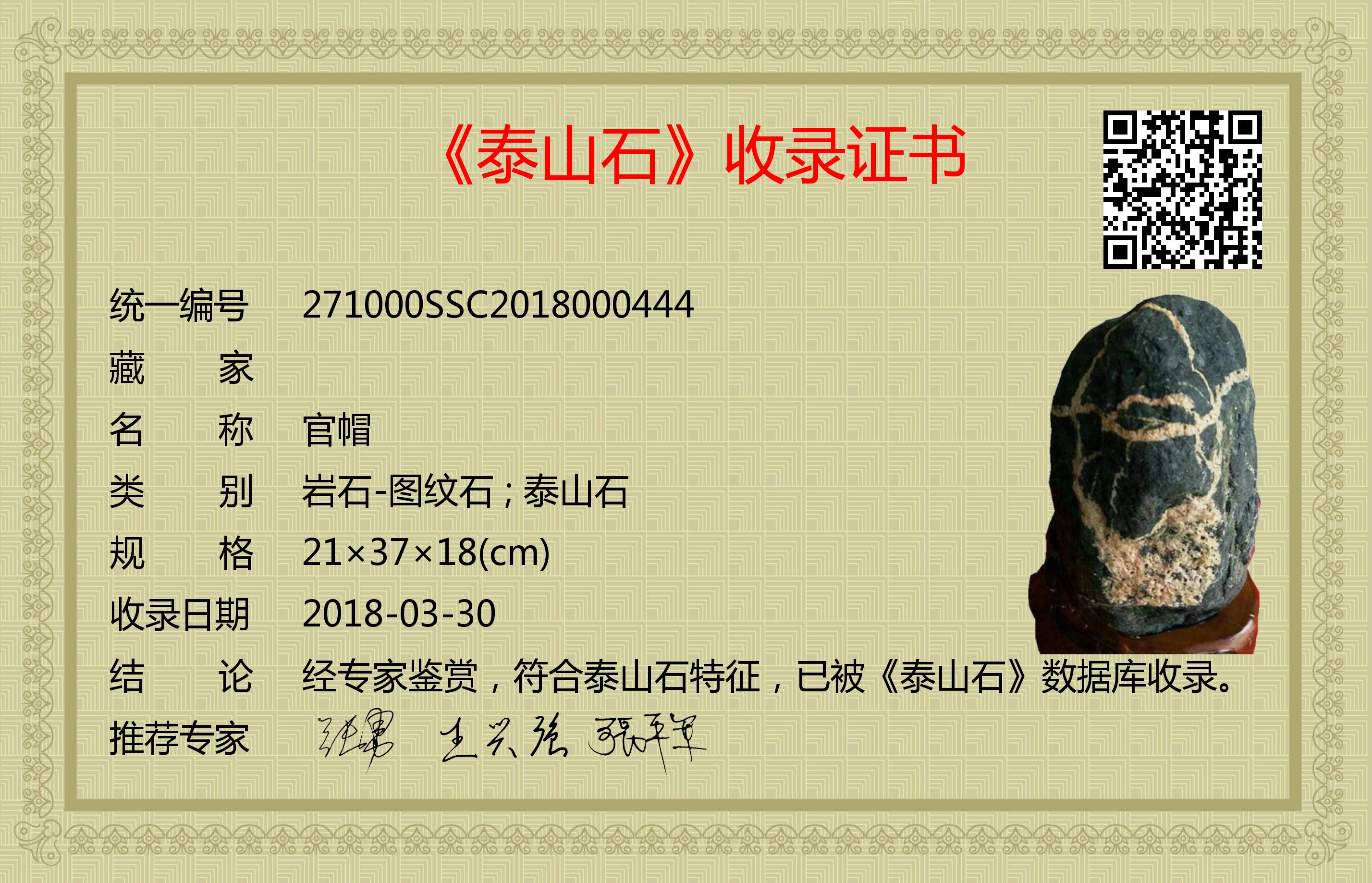 经专家鉴赏,符合泰山石特征,已被《泰山石》数据库收录。