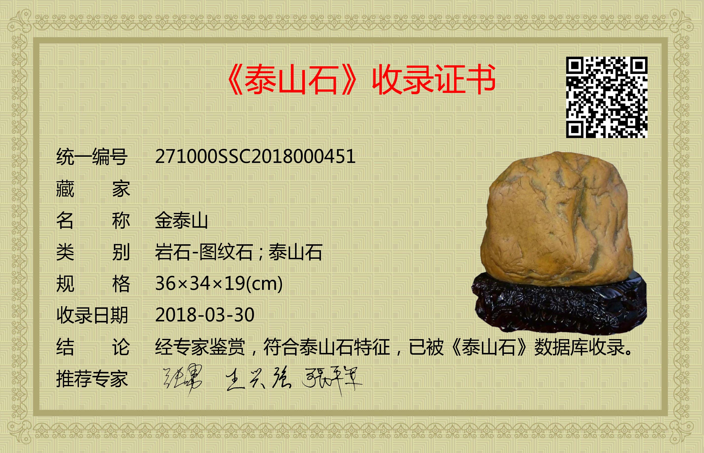 经专家鉴赏,符合泰山石特征,已被《泰山石》数据库收录。