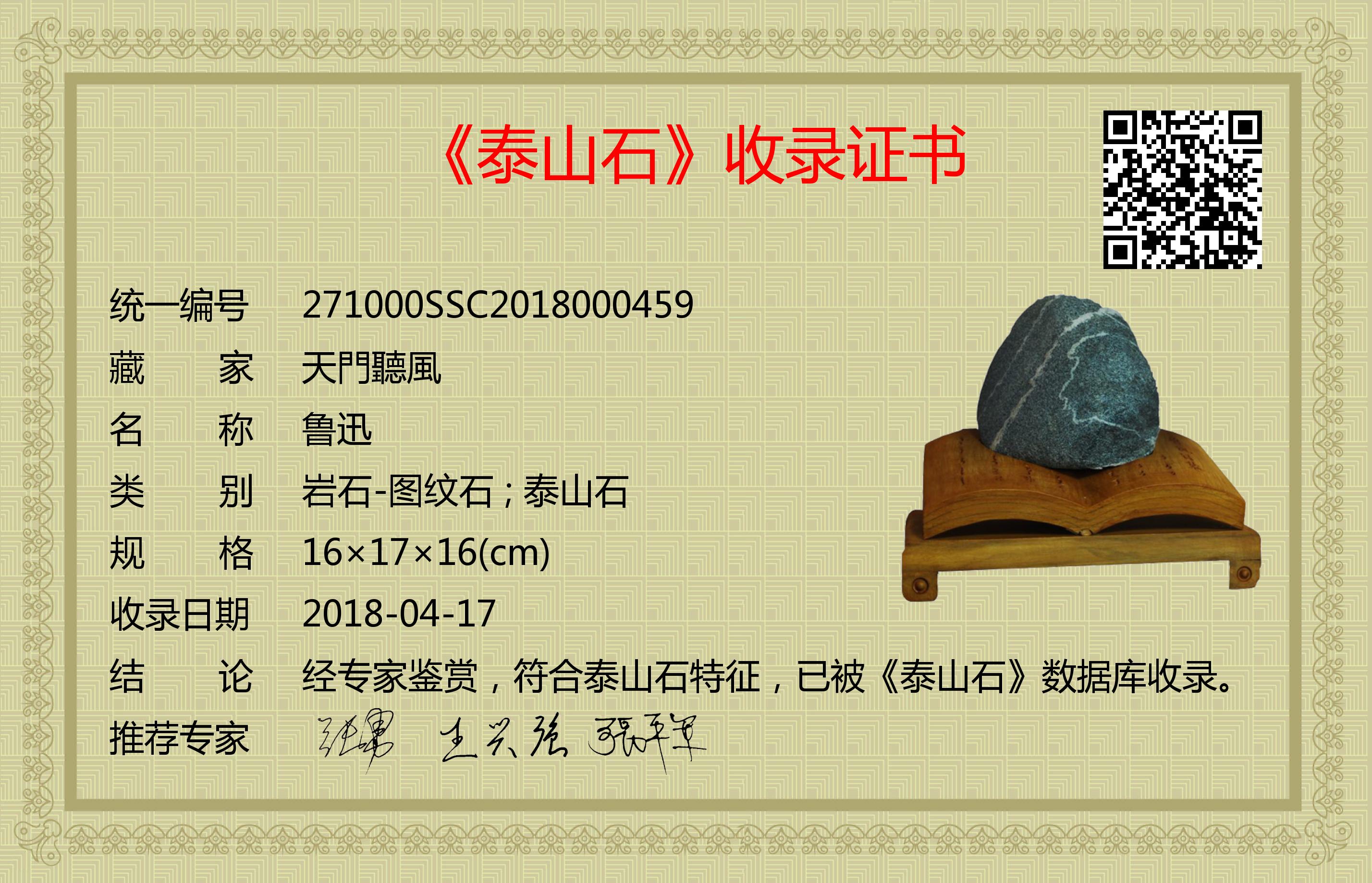 经专家鉴赏,符合泰山石特征,已被《泰山石》数据库收录。