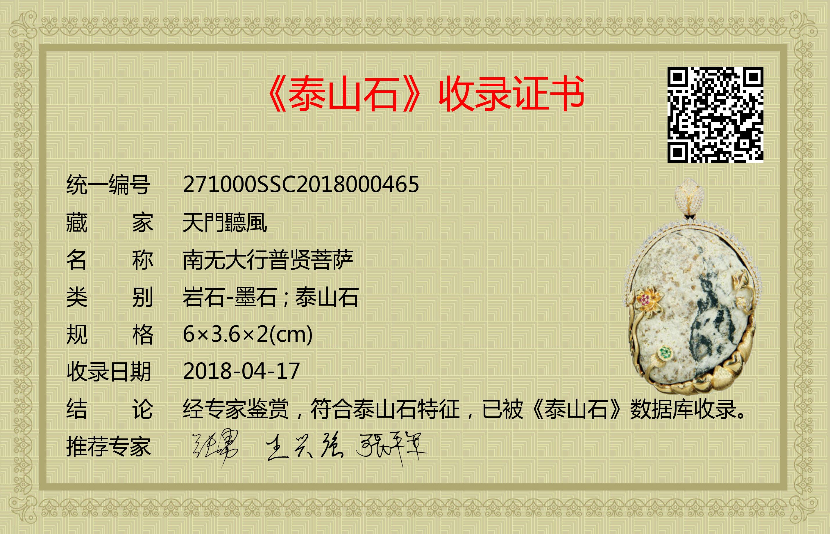 经专家鉴赏,符合泰山石特征,已被《泰山石》数据库收录。