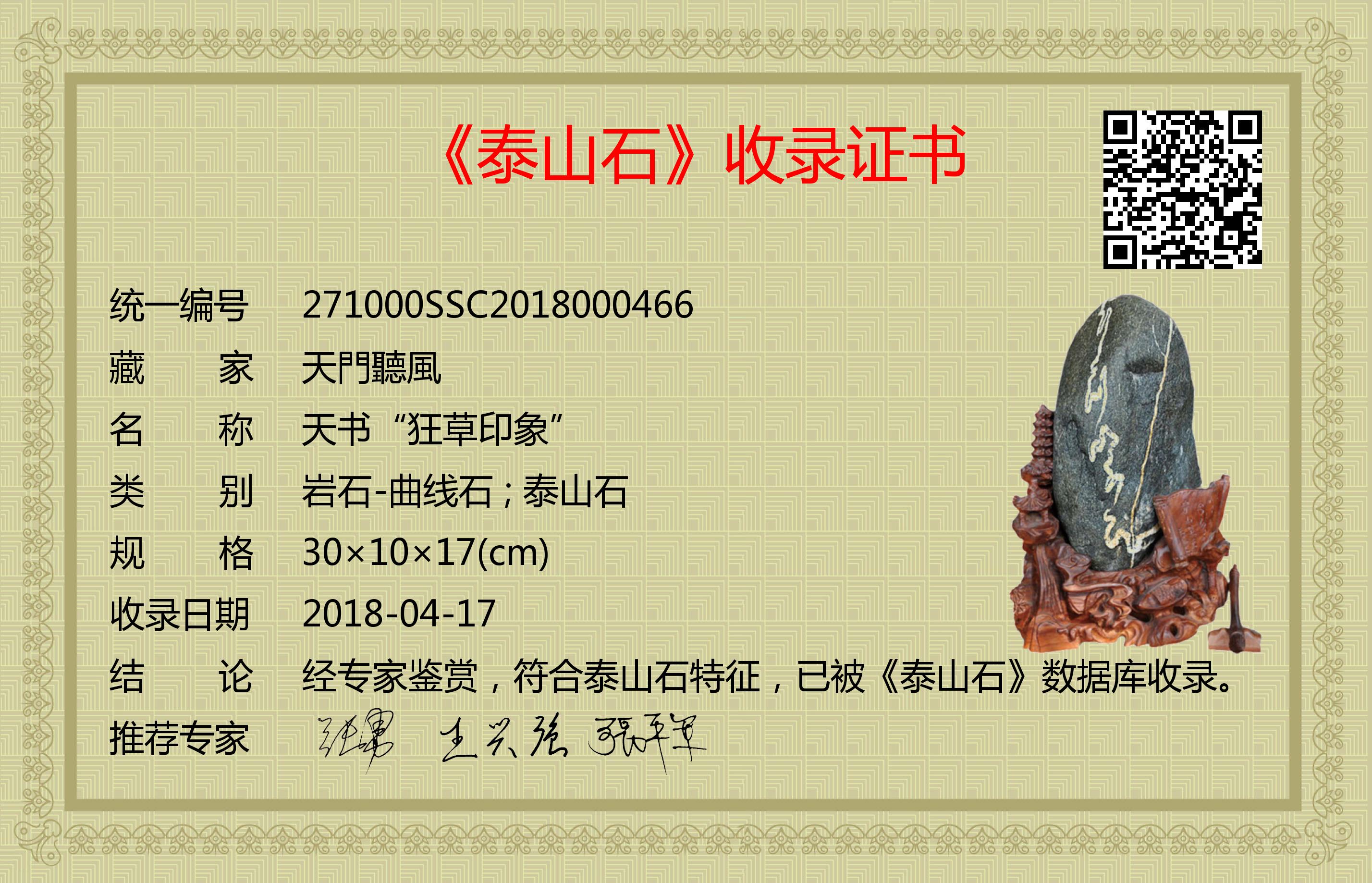 经专家鉴赏,符合泰山石特征,已被《泰山石》数据库收录。