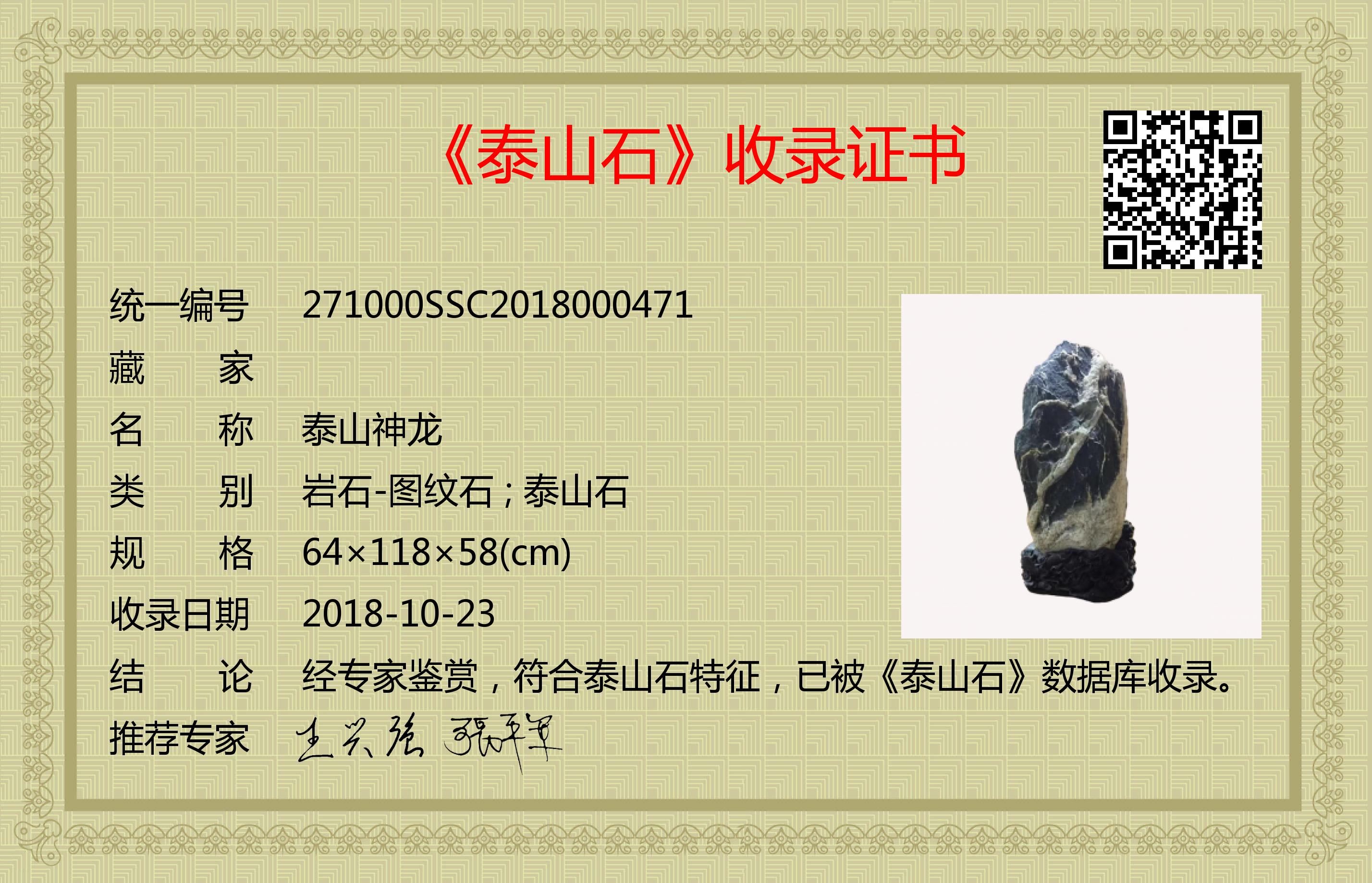 经专家鉴赏,符合泰山石特征,已被《泰山石》数据库收录。