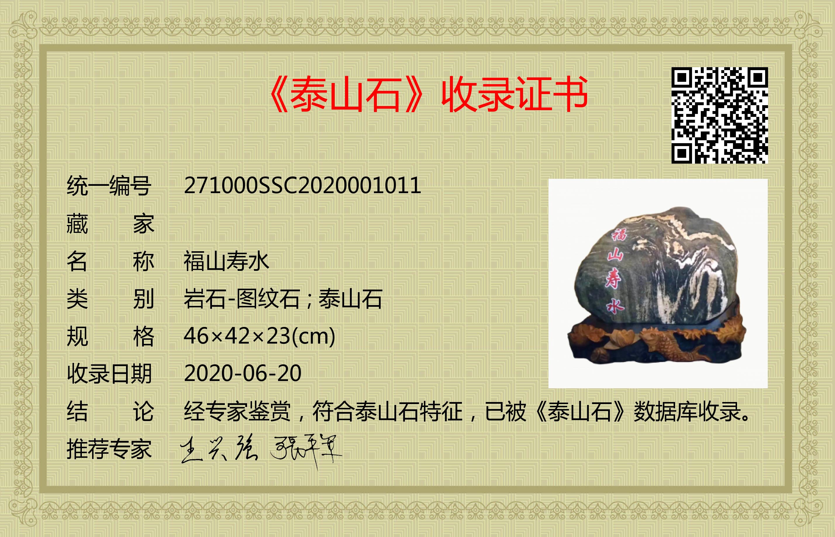 经专家鉴赏,符合泰山石特征,已被《泰山石》数据库收录。