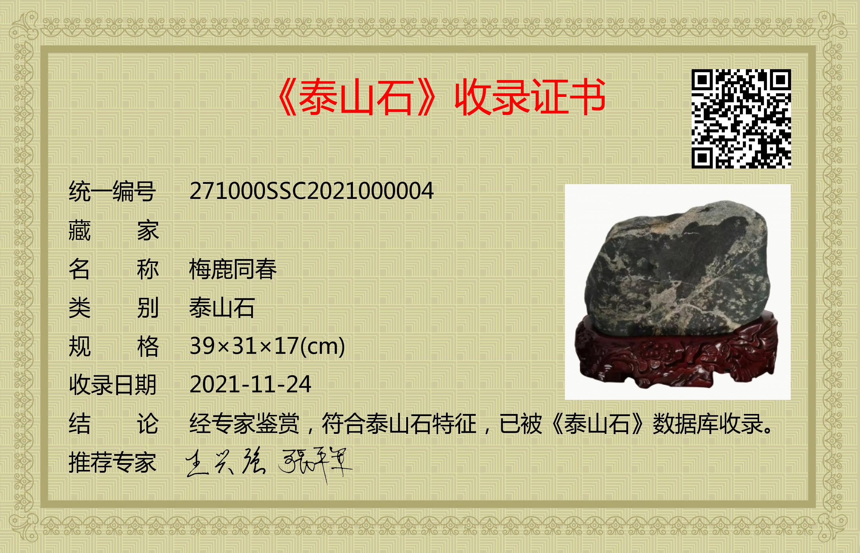 经专家鉴赏,符合泰山石特征,已被《泰山石》数据库收录。