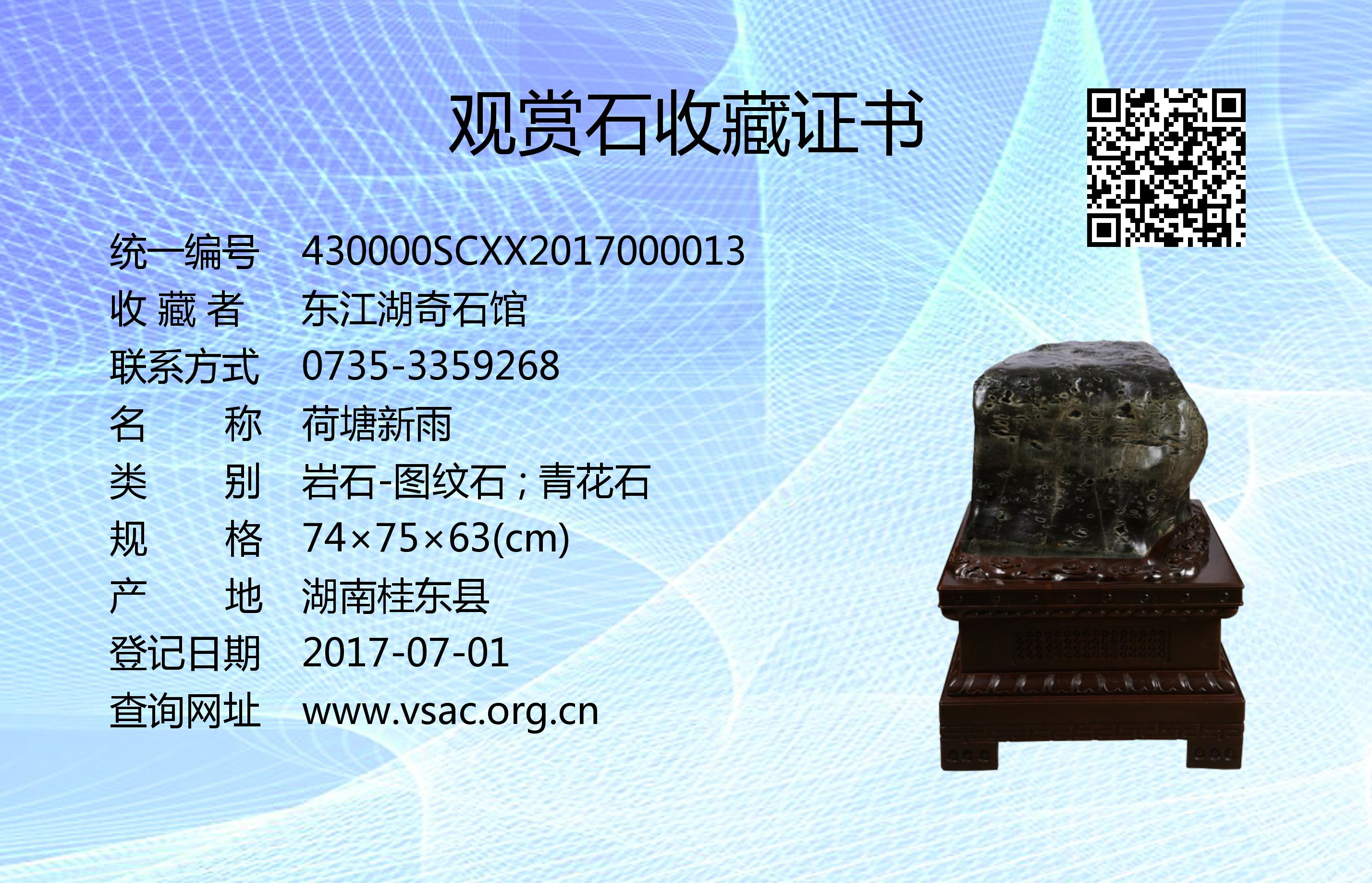 2017年4月8日,国石(北京)鉴定评估有限公司依据《观赏石鉴评》(GB/T31390-2015),鉴评结论为“一级”。