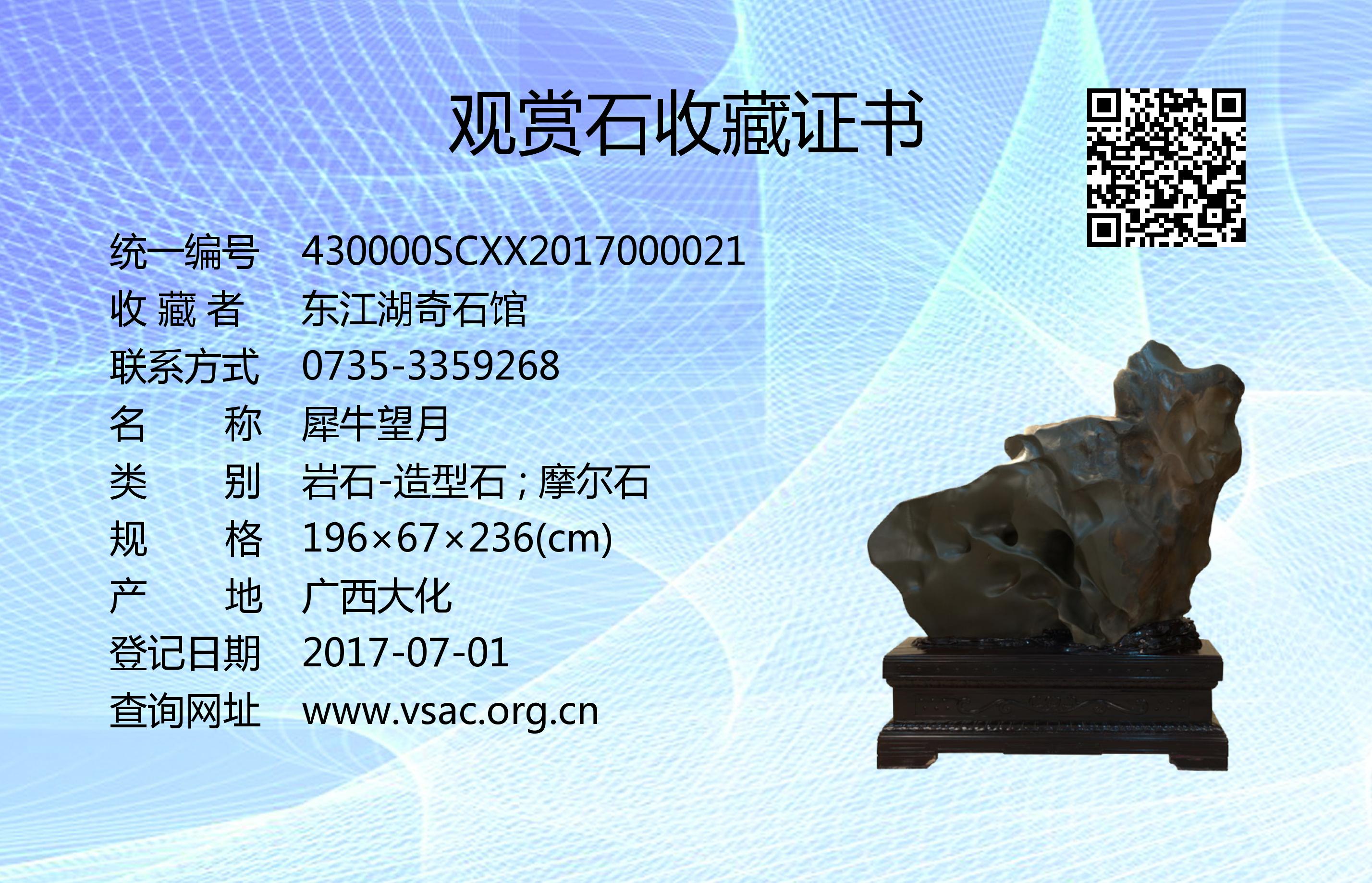 2017年4月8日,国石(北京)鉴定评估有限公司依据《观赏石鉴评》(GB/T31390-2015),鉴评结论为“二级”。
