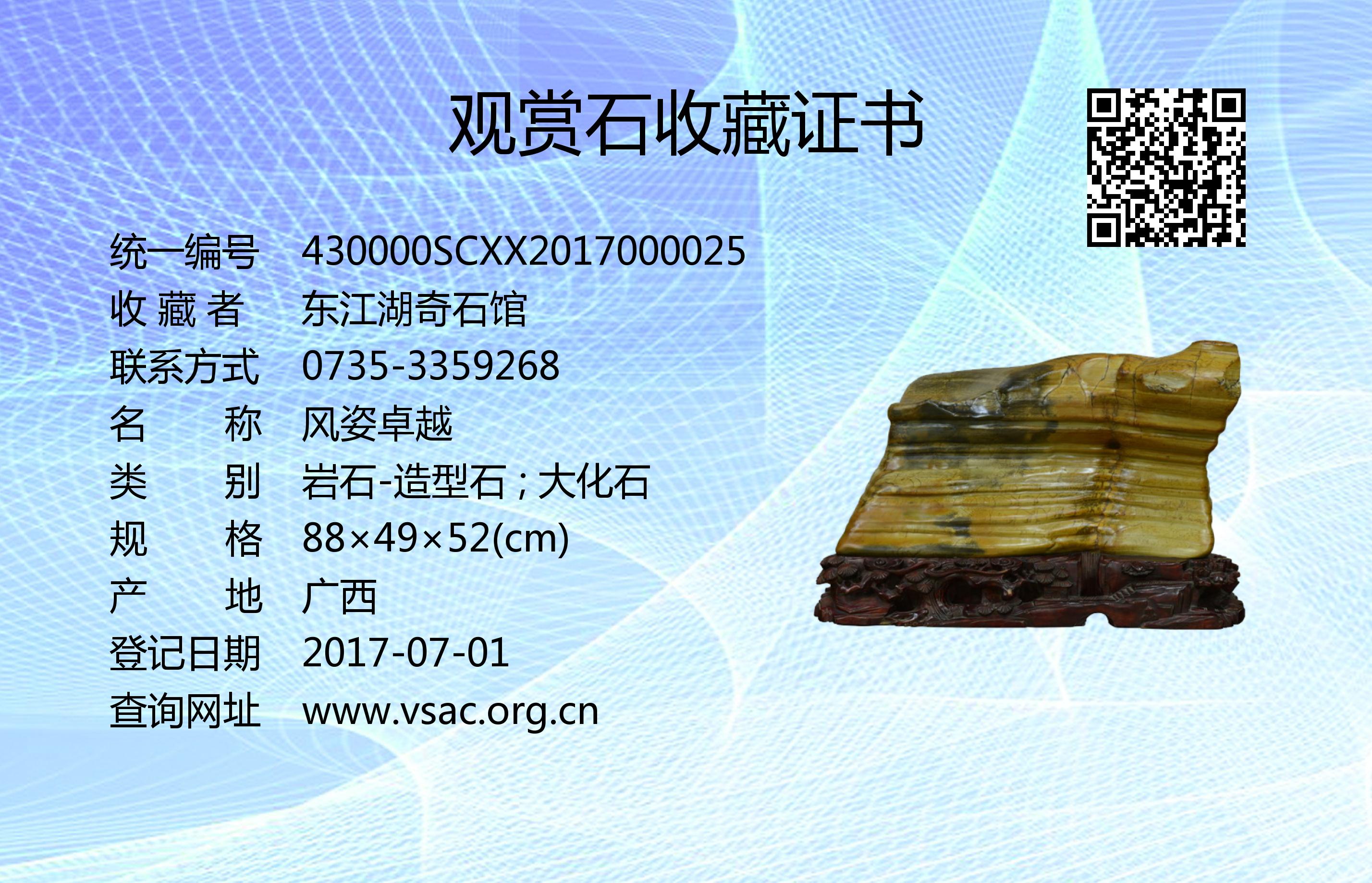 2017年4月8日,国石(北京)鉴定评估有限公司依据《观赏石鉴评》(GB/T31390-2015),鉴评结论为“一级”。