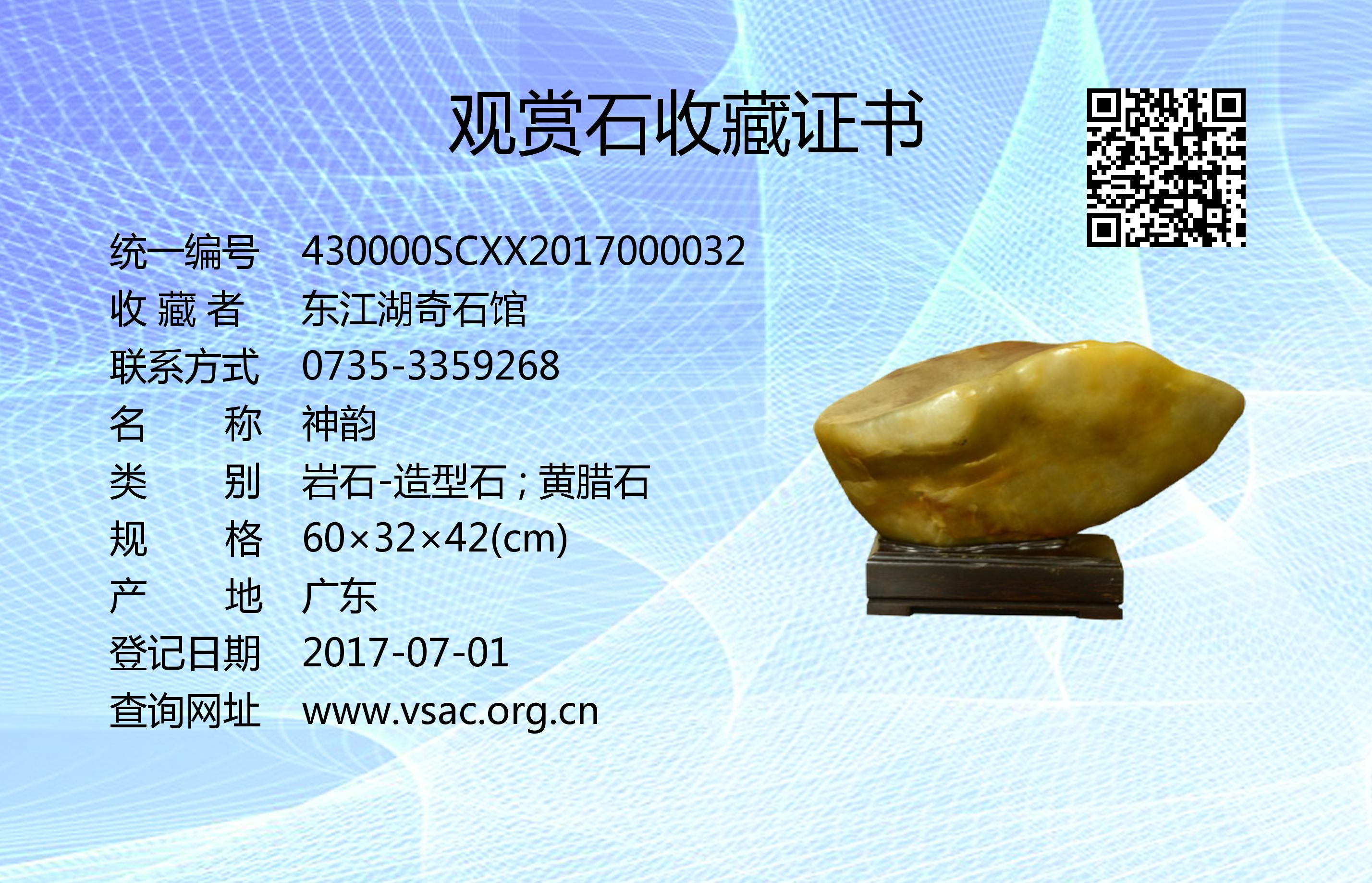 2017年4月8日,国石(北京)鉴定评估有限公司依据《观赏石鉴评》(GB/T31390-2015),鉴评结论为“一级”。