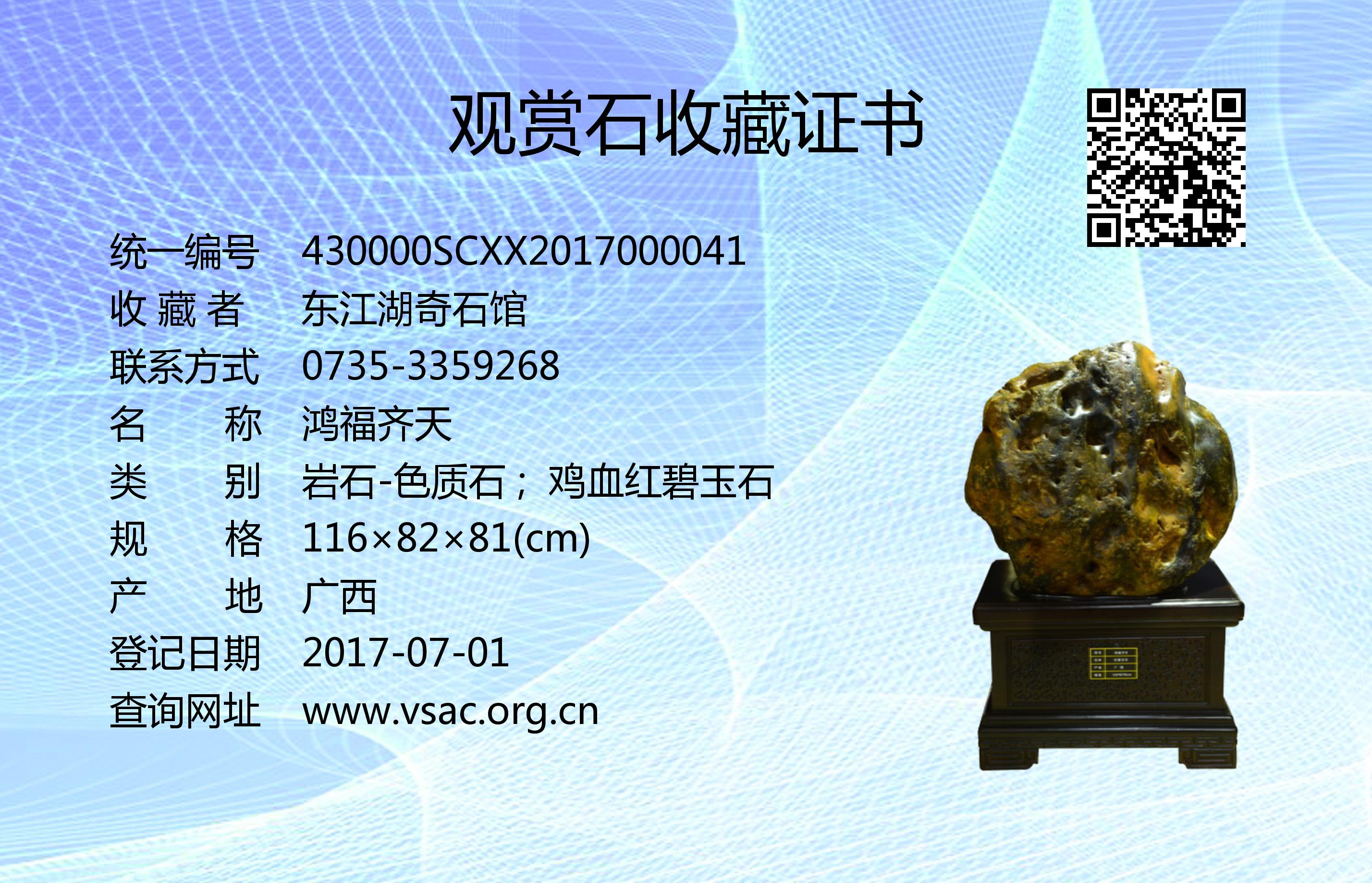 2017年4月8日,国石(北京)鉴定评估有限公司依据《观赏石鉴评》(GB/T31390-2015),鉴评结论为“二级”。