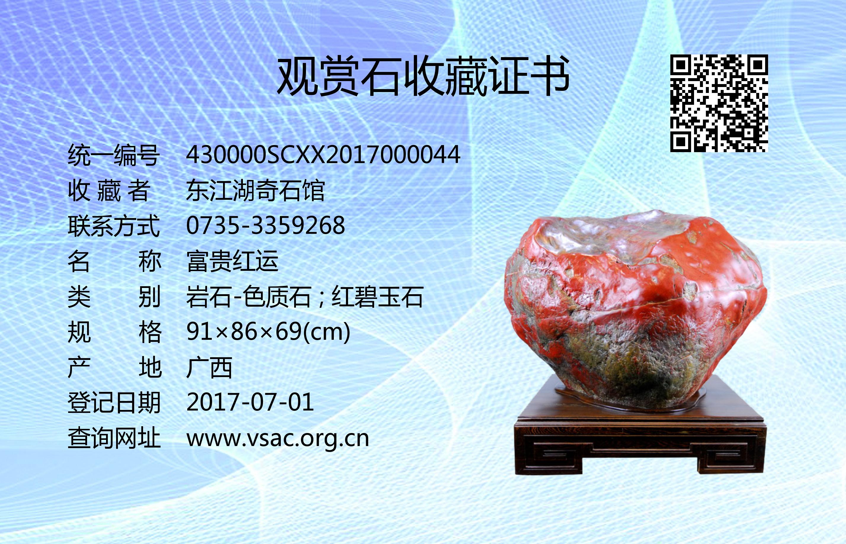 2017年4月8日,国石(北京)鉴定评估有限公司依据《观赏石鉴评》(GB/T31390-2015),鉴评结论为“二级”。