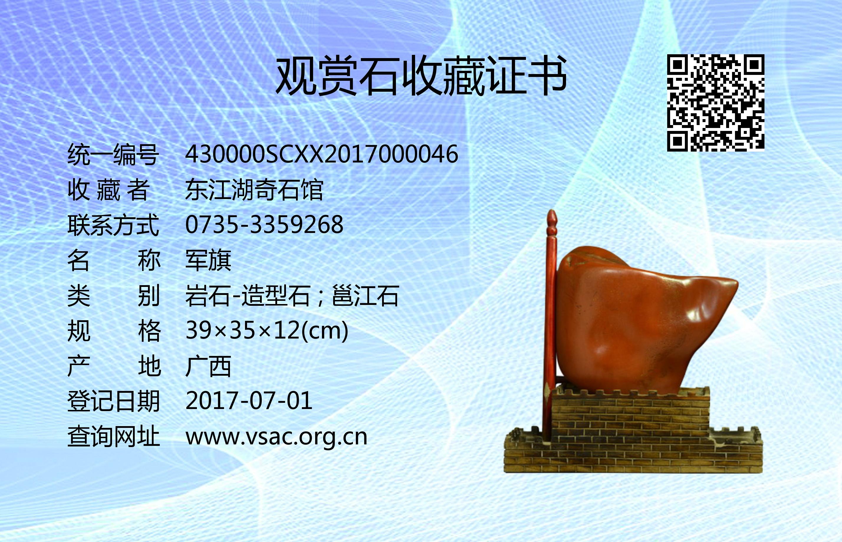 2017年4月8日,国石(北京)鉴定评估有限公司依据《观赏石鉴评》(GB/T31390-2015),鉴评结论为“一级”。