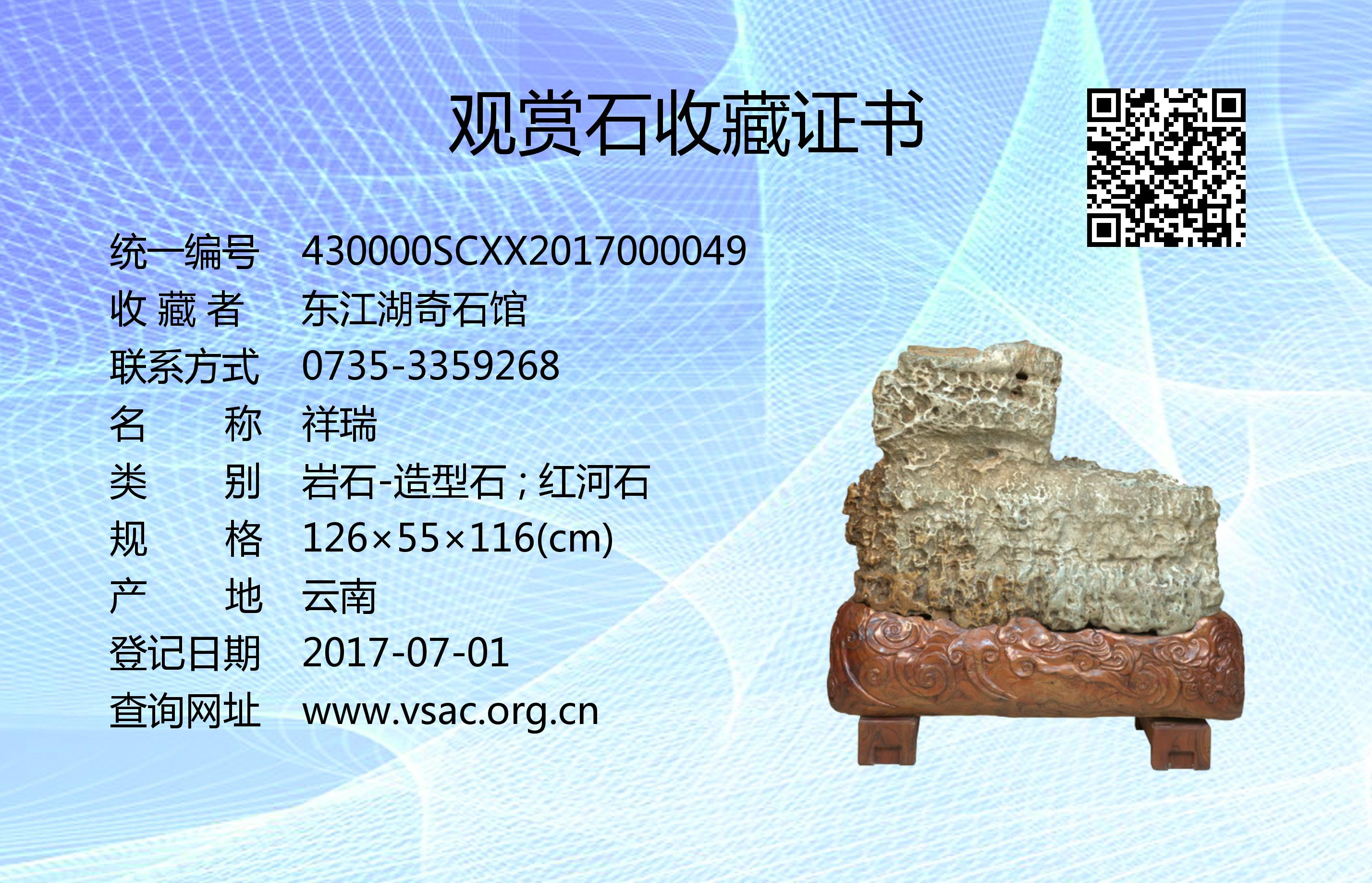 2017年4月8日,国石(北京)鉴定评估有限公司依据《观赏石鉴评》(GB/T31390-2015),鉴评结论为“一级”。