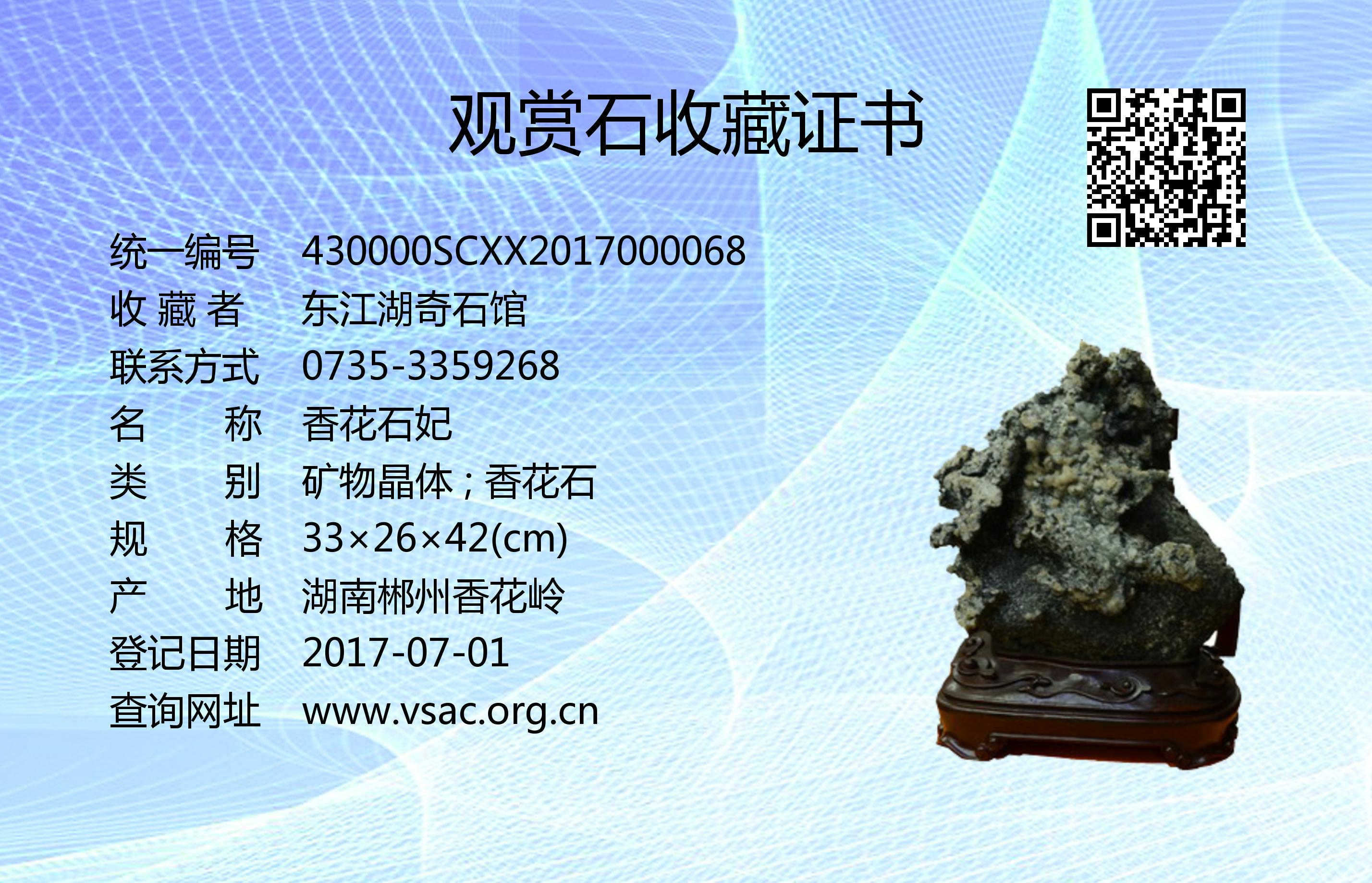 2017年4月8日,国石(北京)鉴定评估有限公司依据《观赏石鉴评》(GB/T31390-2015),鉴评结论为“一级”。