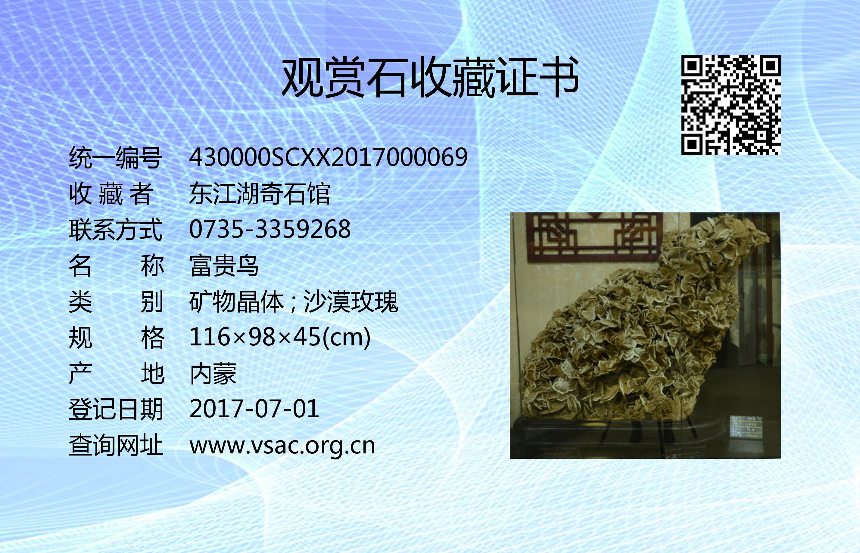 2017年4月8日,国石(北京)鉴定评估有限公司依据《观赏石鉴评》(GB/T31390-2015),鉴评结论为“二级”。