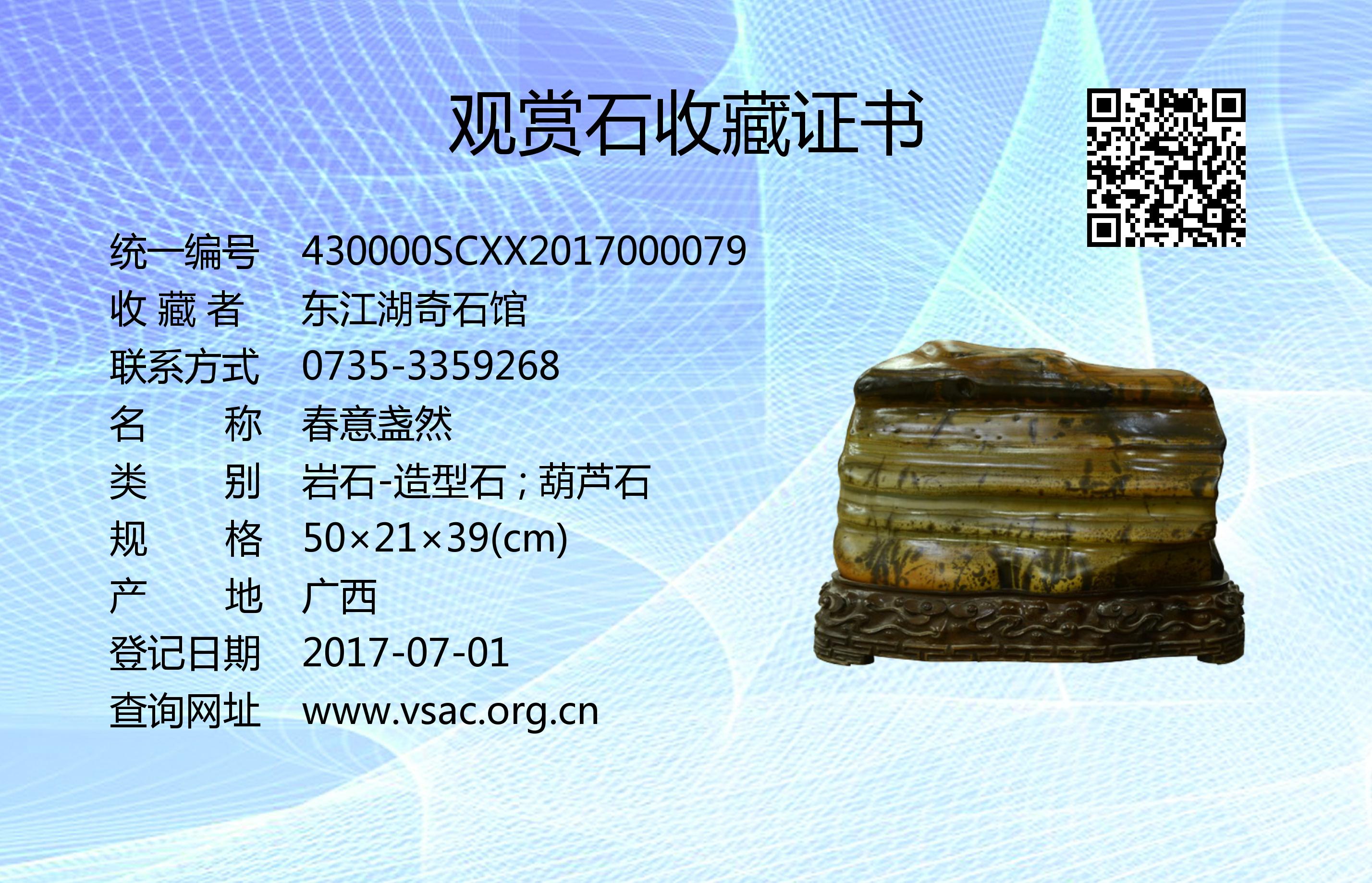 2017年4月8日,国石(北京)鉴定评估有限公司依据《观赏石鉴评》(GB/T31390-2015),鉴评结论为“二级”。