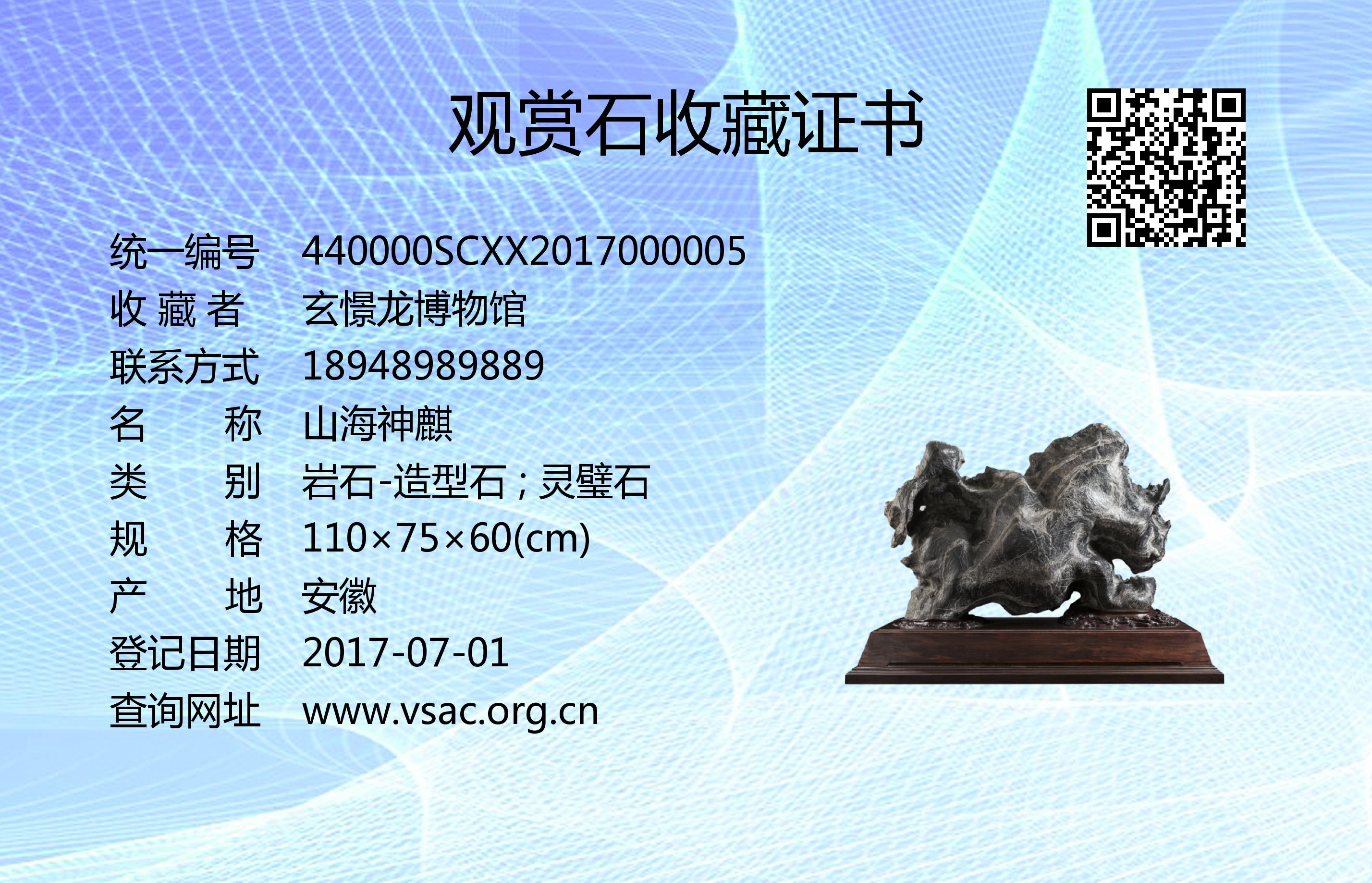 2016年8月8日,国石(北京)鉴定评估有限公司依据《观赏石鉴评》(GB/T31390-2015),鉴评结论为“特级”。