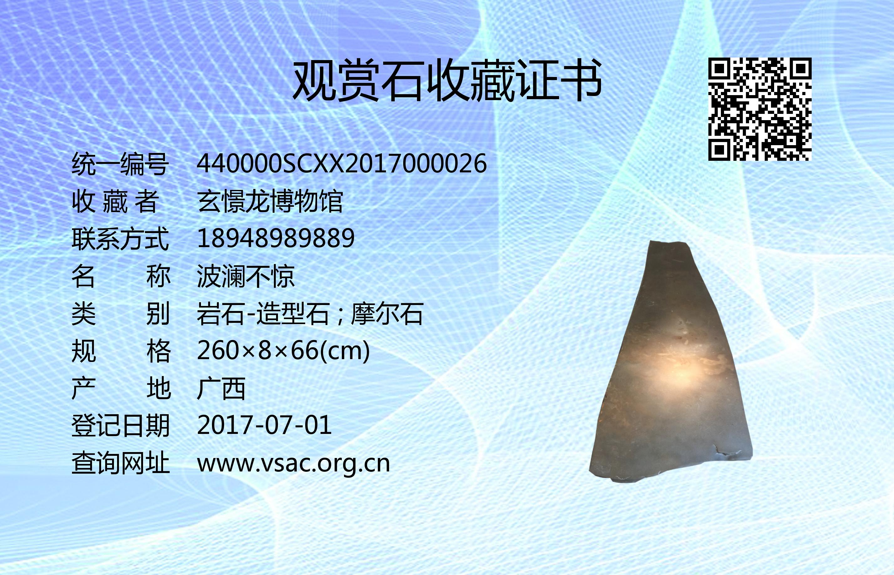 2016年8月8日,国石(北京)鉴定评估有限公司依据《观赏石鉴评》(GB/T31390-2015),鉴评结论为“三级”。