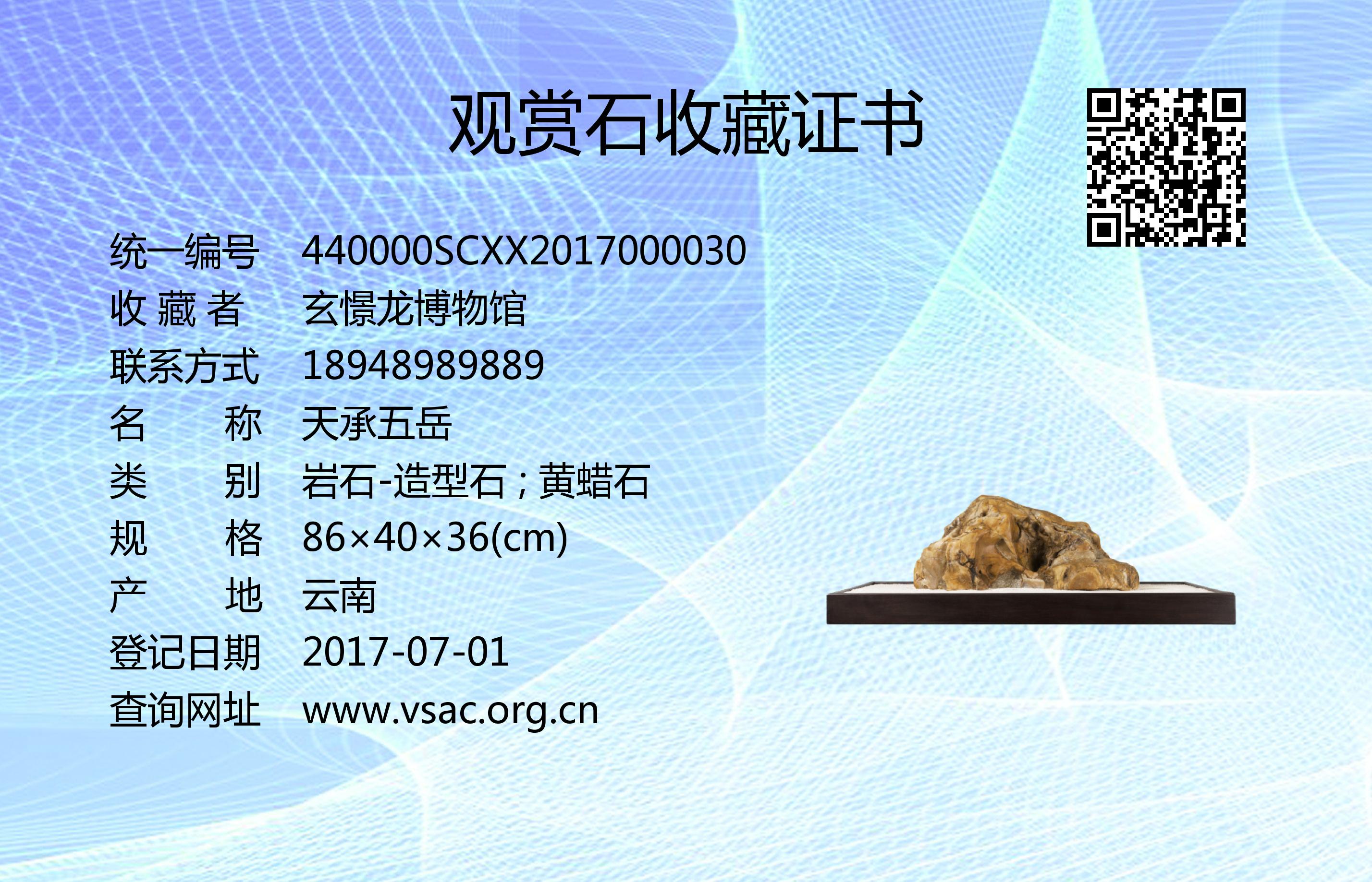 2016年8月8日,国石(北京)鉴定评估有限公司依据《观赏石鉴评》(GB/T31390-2015),鉴评结论为“一级”。