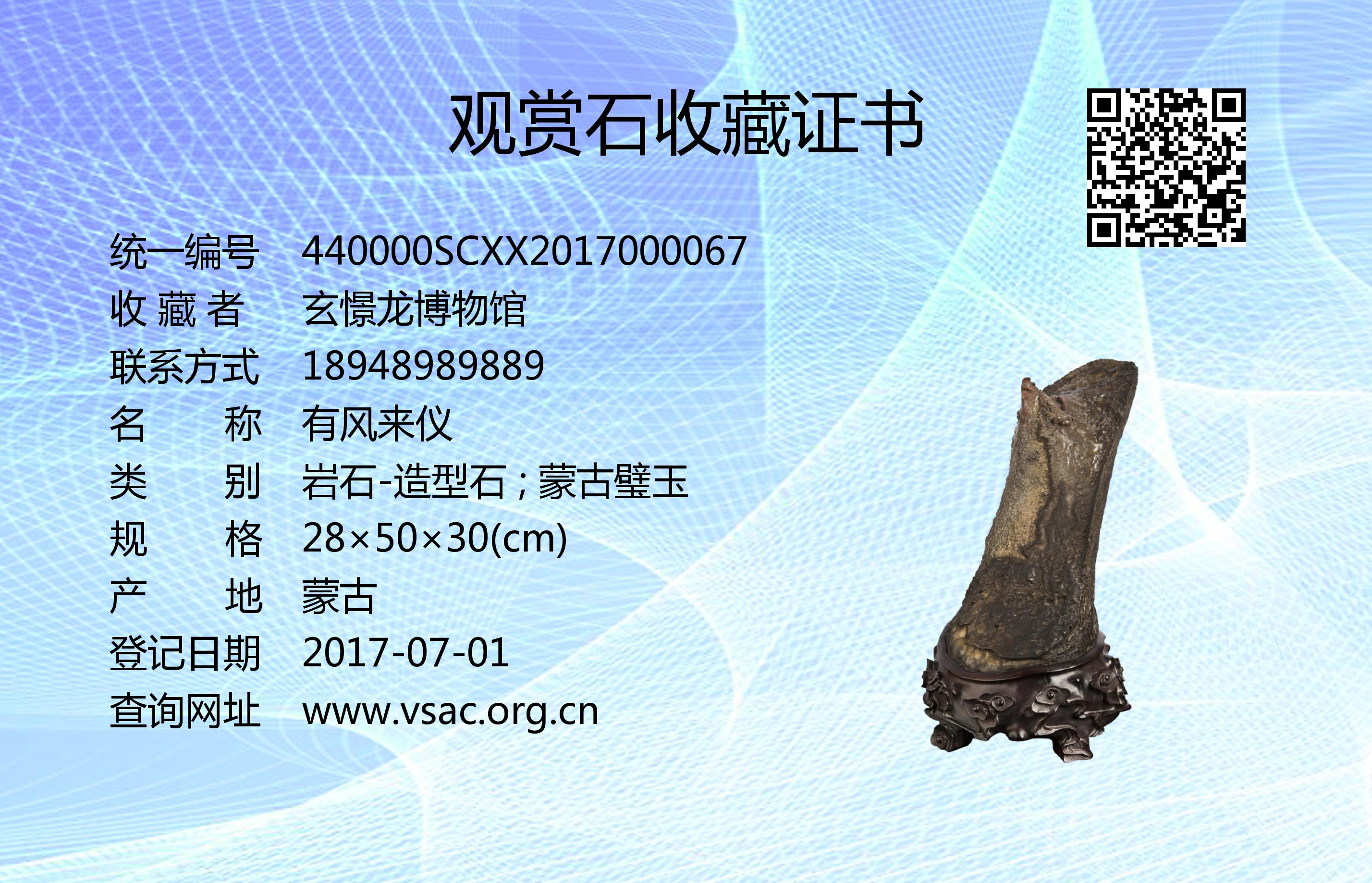 2016年8月8日,国石(北京)鉴定评估有限公司依据《观赏石鉴评》(GB/T31390-2015),鉴评结论为“一级”。