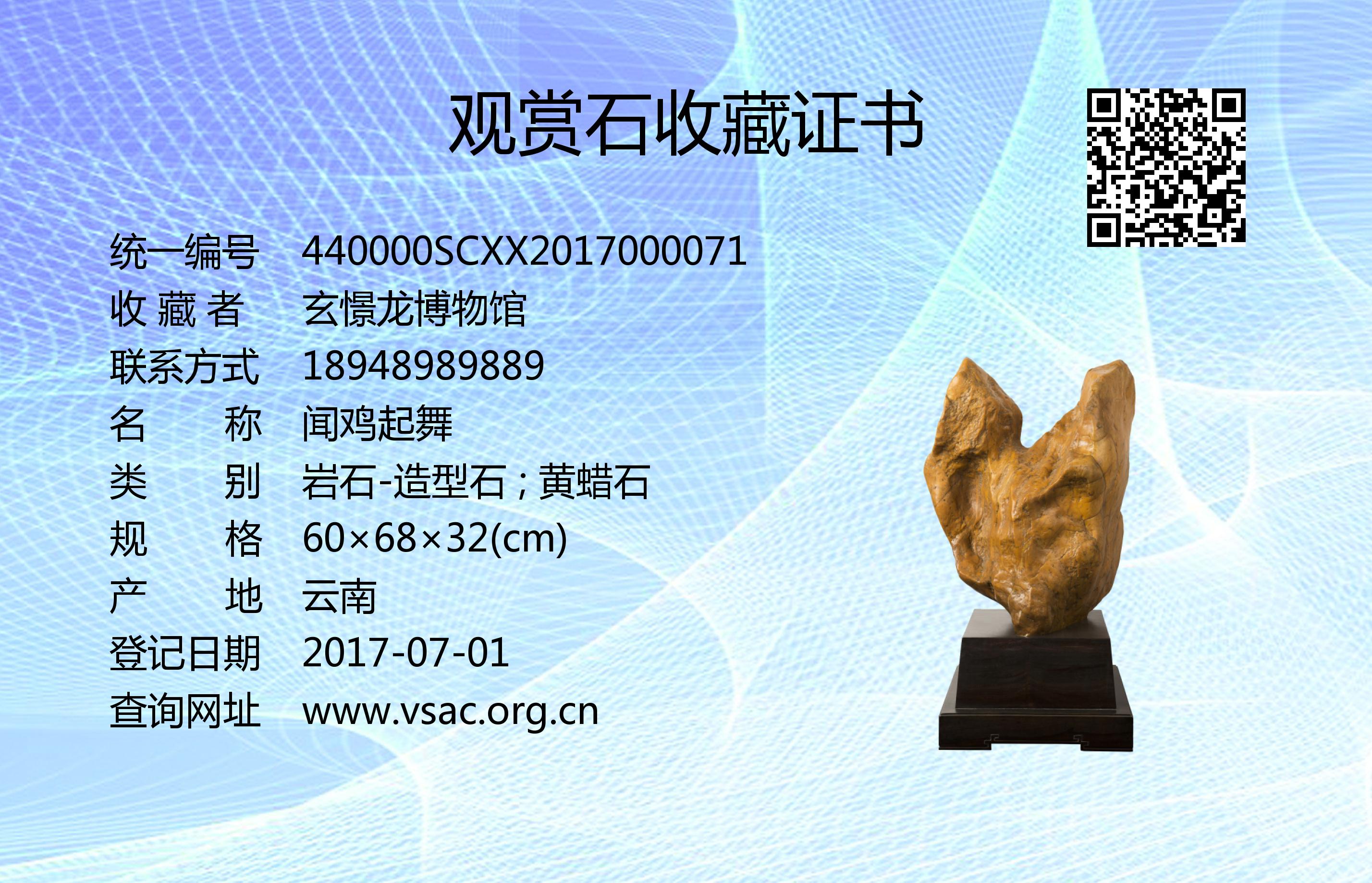 2016年8月8日,国石(北京)鉴定评估有限公司依据《观赏石鉴评》(GB/T31390-2015),鉴评结论为“一级”。