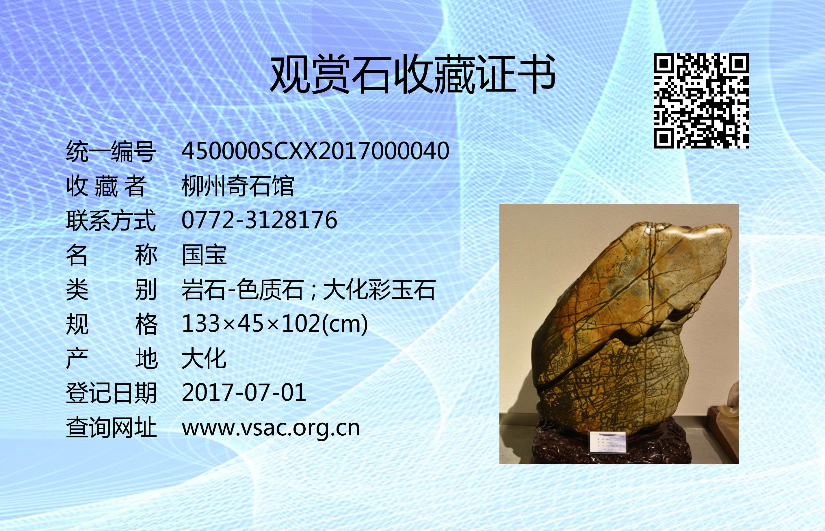 2016年11月30日,国石(北京)鉴定评估有限公司依据《观赏石鉴评》(GB/T31390-2015),鉴评结论为“特级”。